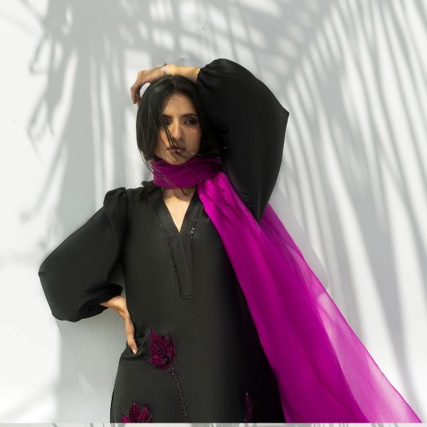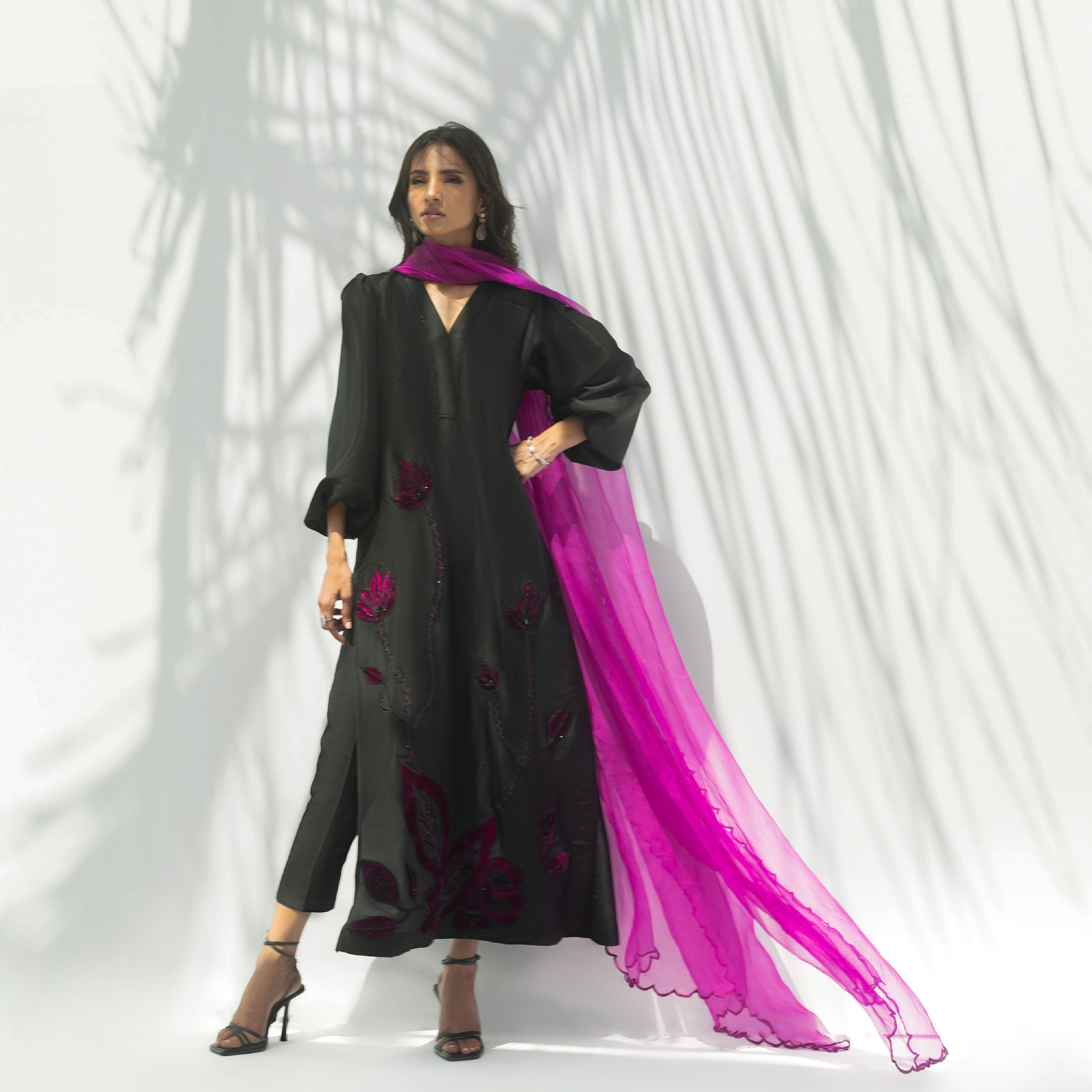 This striking ensemble features a luxurious black pure raw silk shirt, beautifully complemented by khadi silk pants for a rich, elegant feel. The shirt is adorned with stunning purple appliqué, meticulously paired with intricate handwork that adds depth and sophistication. The look is completed with a regal purple dupatta, featuring scalloped edges on all sides, bringing a graceful finishing touch. Perfect for upscale events or any celebration that calls for refined elegance.