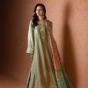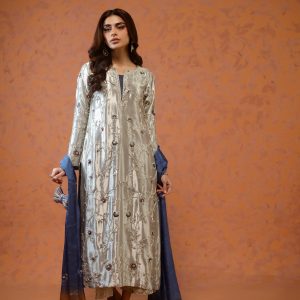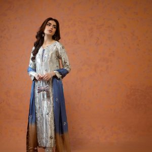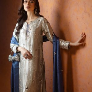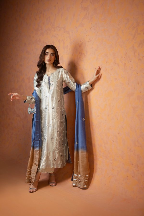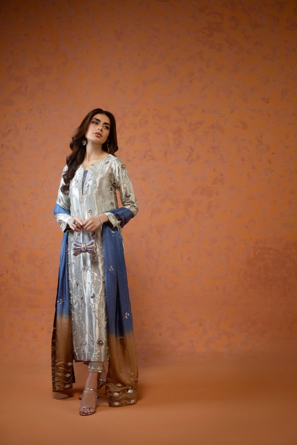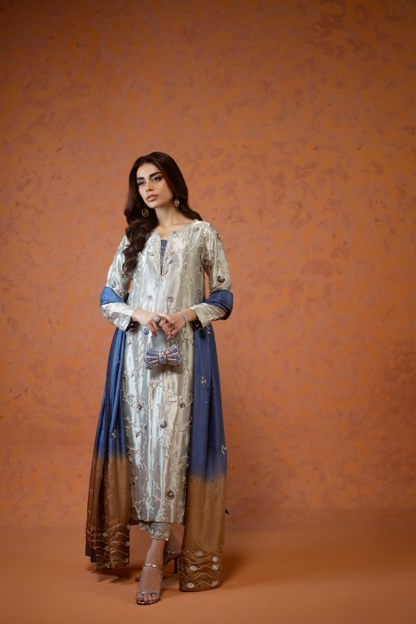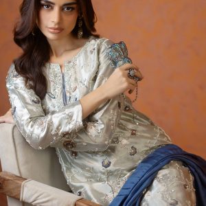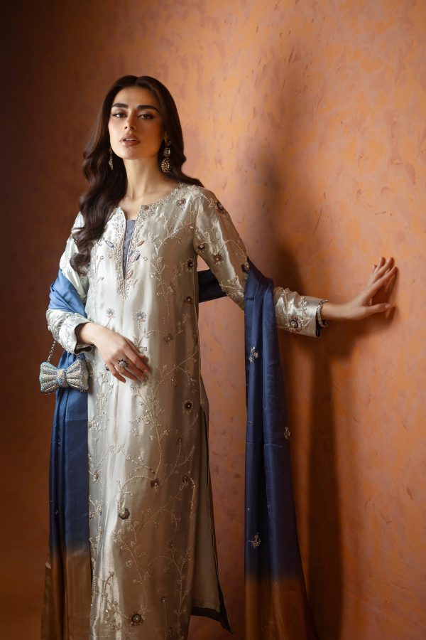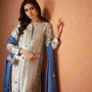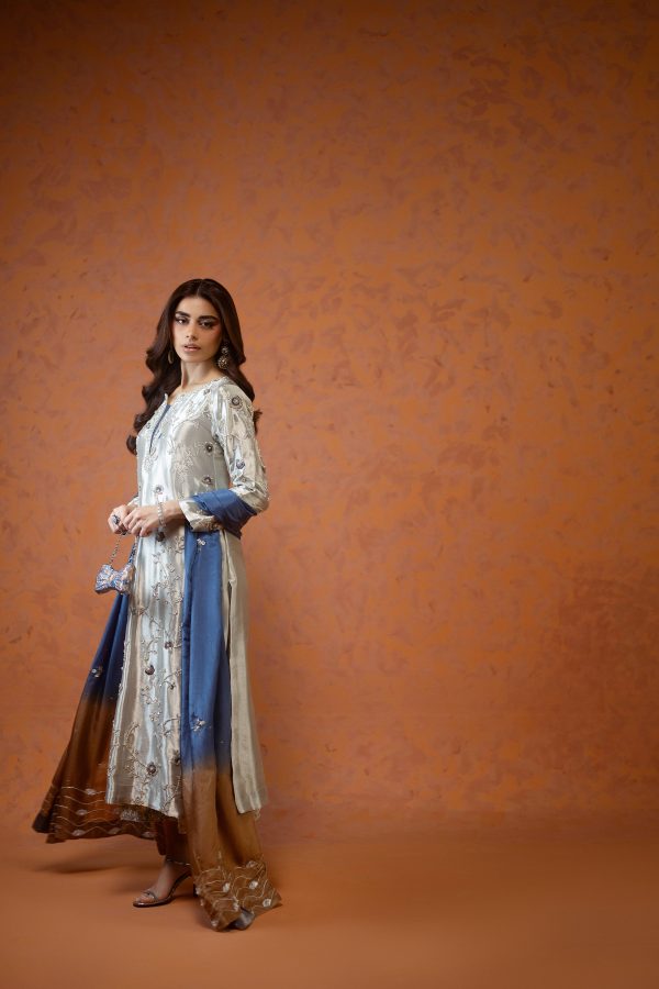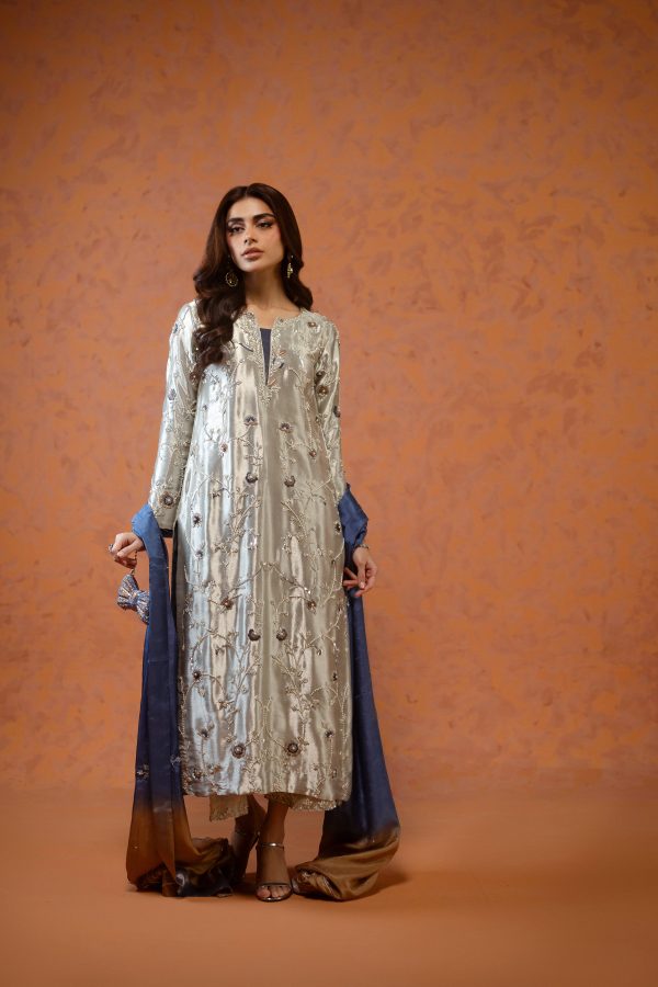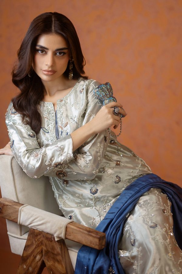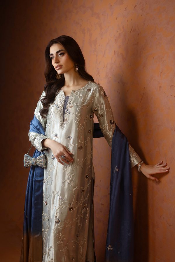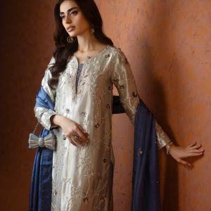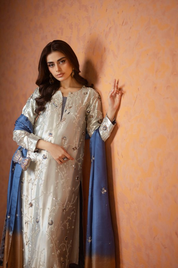 A stunning silver lama silk shirt and pants, intricately adorned with dabka, sequins, and cut dana handwork all over the shirt. Paired with elegant lama culottes featuring detailed embellishments and styled with a medium silk double shaded blue dupatta, beautifully finished with delicate booti and chan work. A perfect choice for festive celebrations