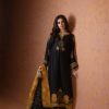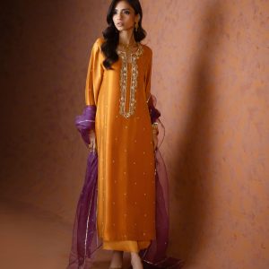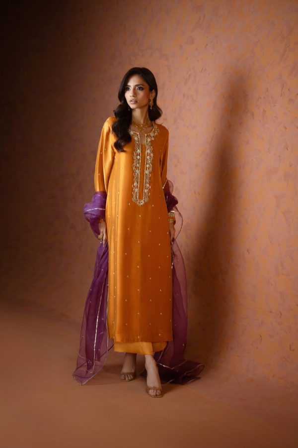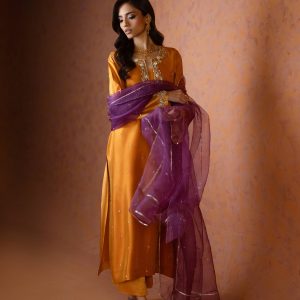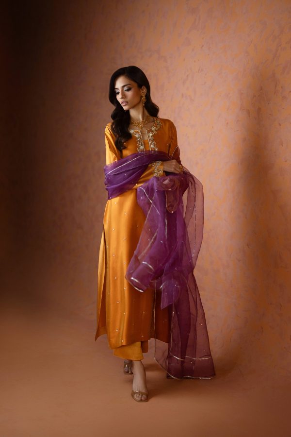 An elegant orange butter silk shirt adorned with intricate handwork of tikki stones, sitara, and cut dana, paired with matching culottes and a contrasting purple organza dupatta delicately embellished with chan all over. Perfect for weddings and festive occasions.