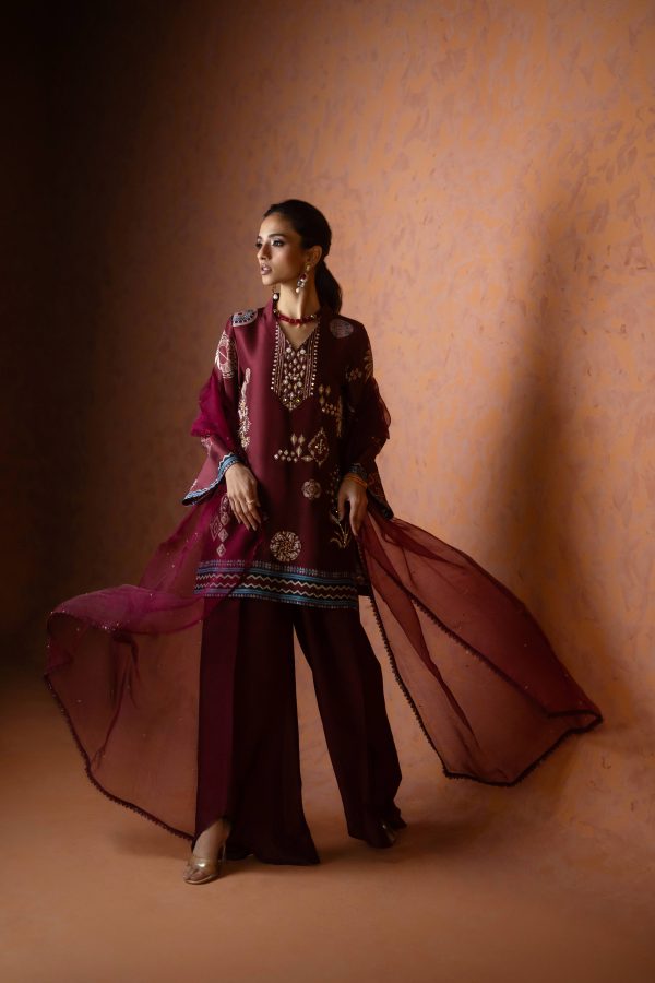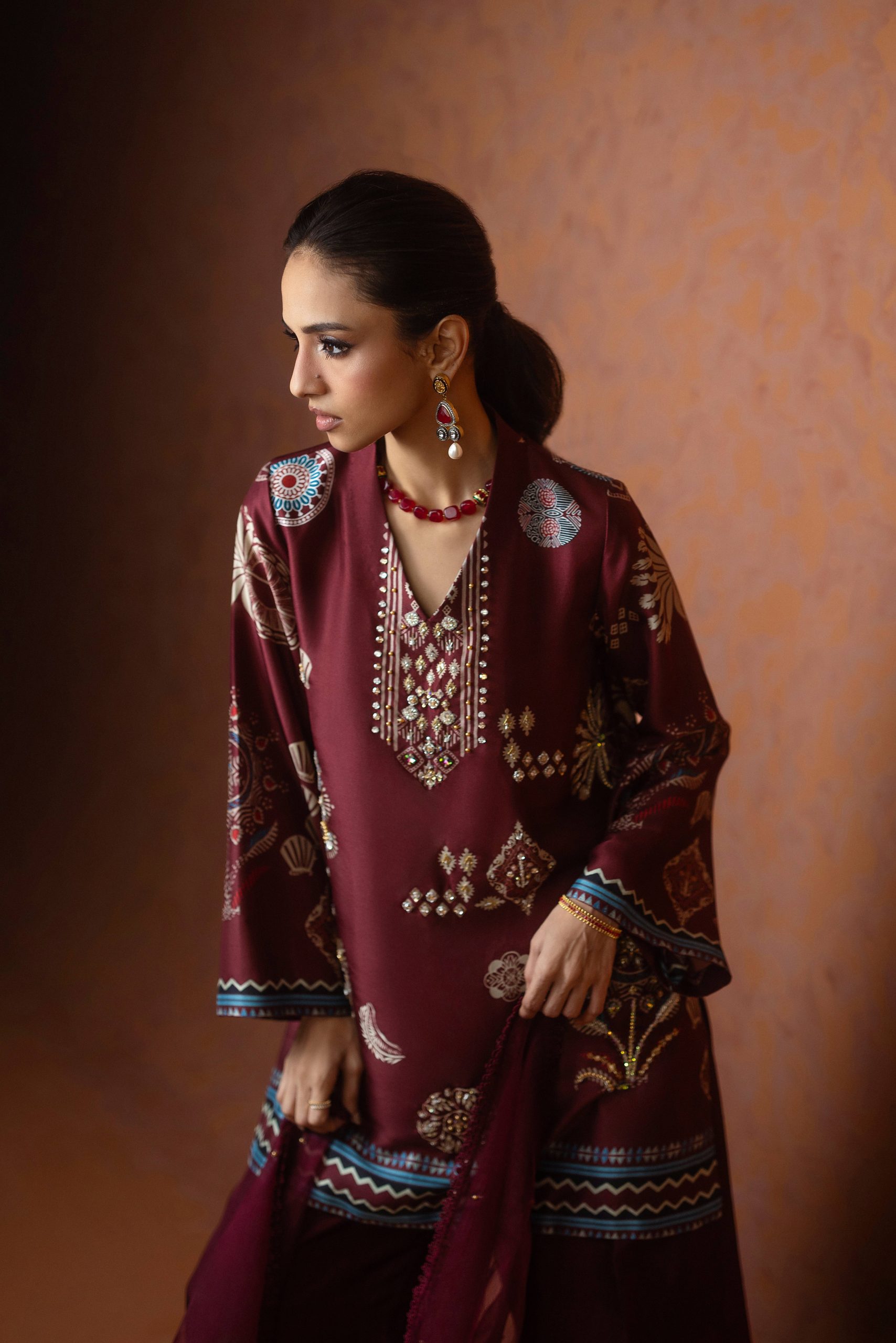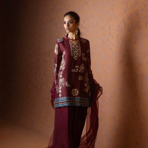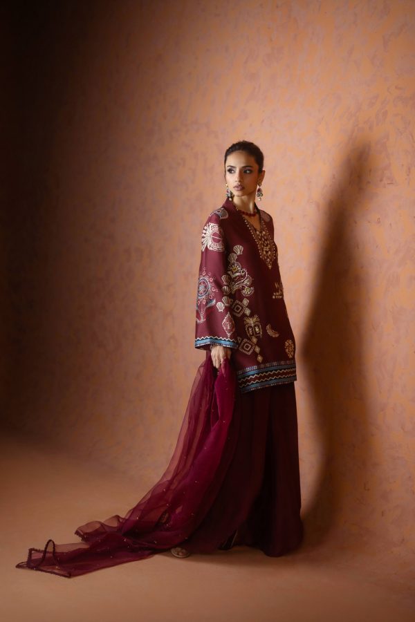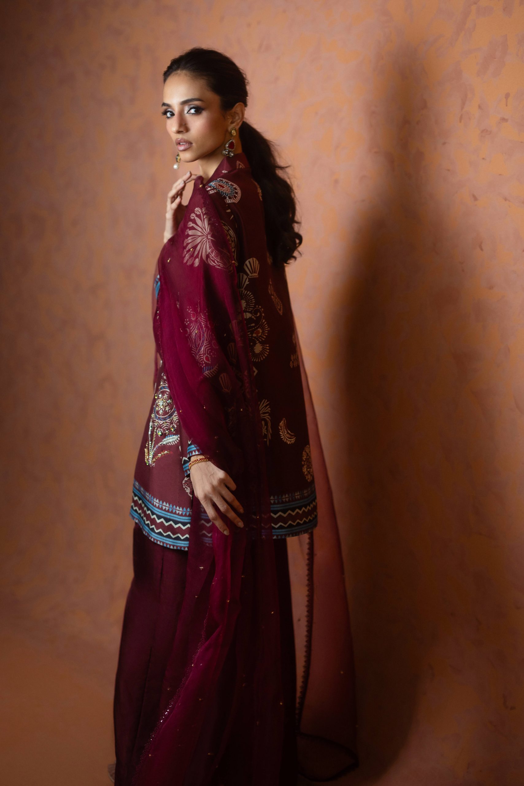 A sophisticated burgundy pure raw silk printed shirt enhanced with delicate handwork, paired with pure raw silk front-slit flared pants. Completed with an organza dupatta adorned with pearl chan and finished with graceful laces a refined ensemble perfect for festive occasions.