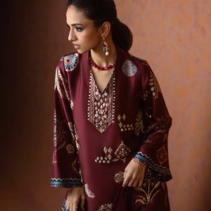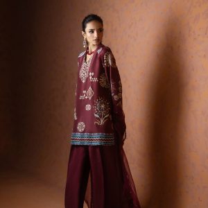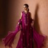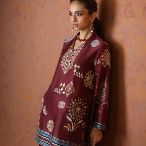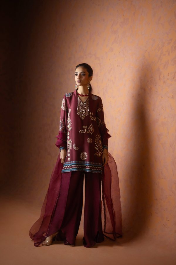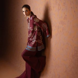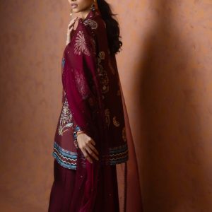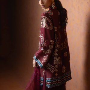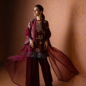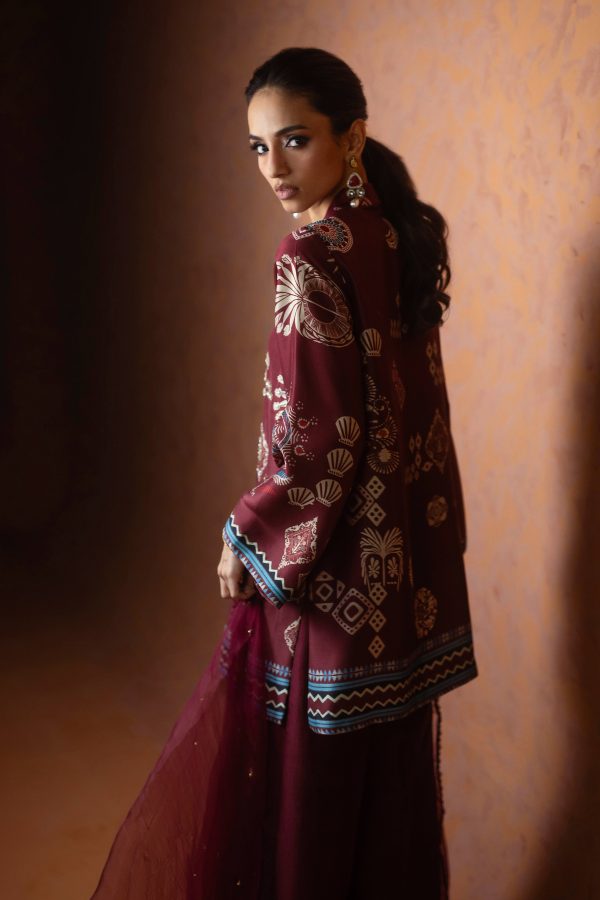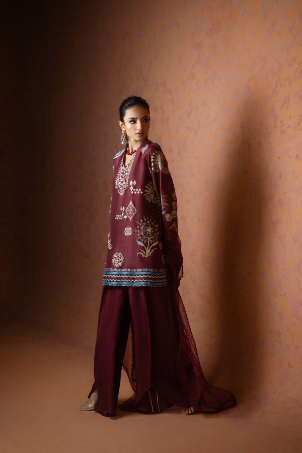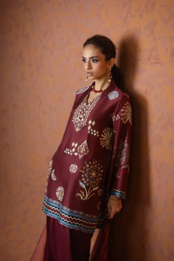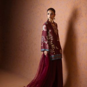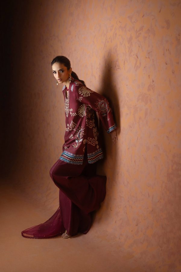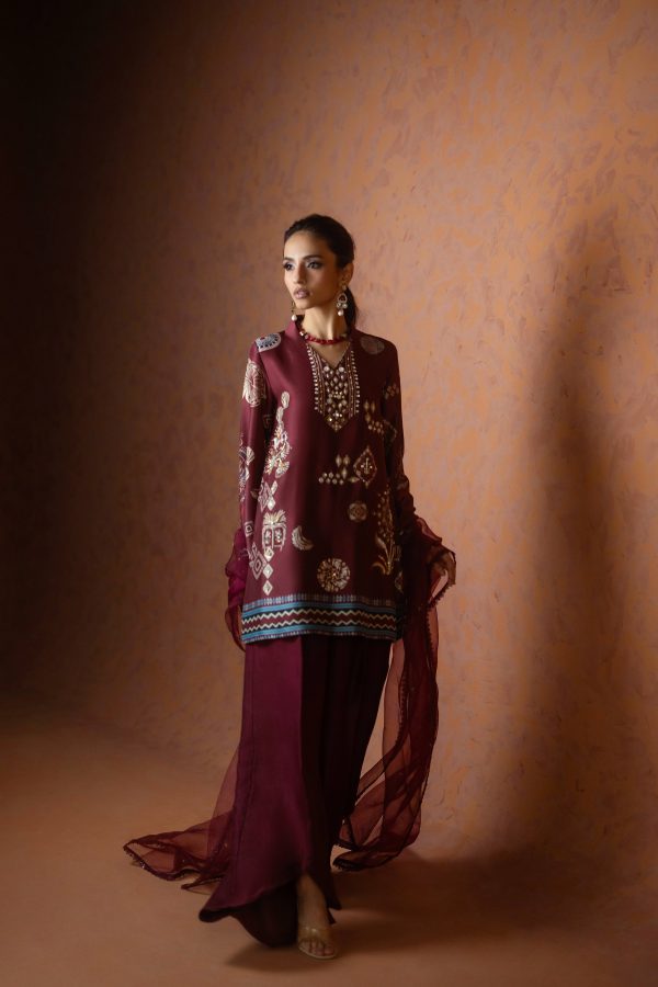 A sophisticated burgundy pure raw silk printed shirt enhanced with delicate handwork, paired with pure raw silk front-slit flared pants. Completed with an organza dupatta adorned with pearl chan and finished with graceful laces a refined ensemble perfect for festive occasions.