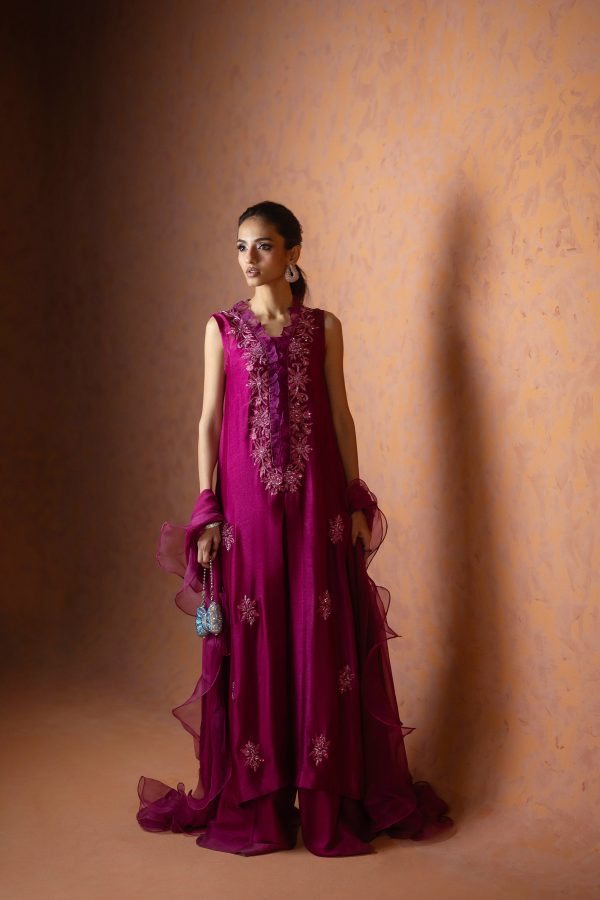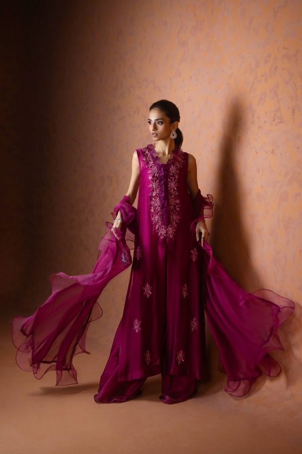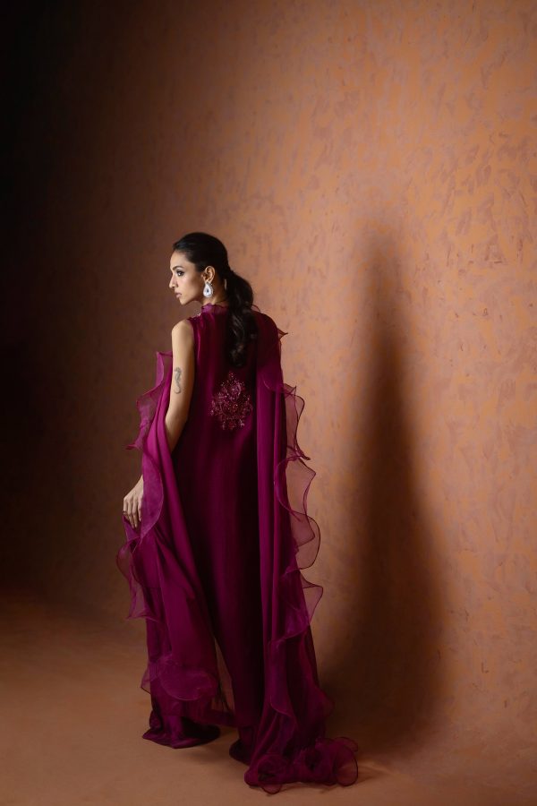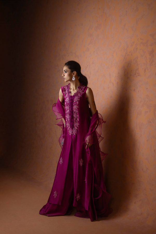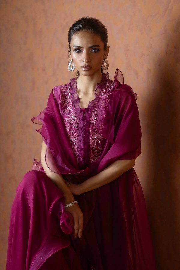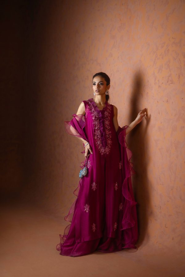 A regal magenta purple sheesha net long front open shirt, richly embellished with heavy aari embroidery and intricate handwork along the neckline, complemented by a delicate motif at the back. This sleeveless ensemble comes with a slip underneath, paired with flared butter silk pants for a graceful flow. The look is completed with a ruffled organza dupatta, adding a touch of drama and elegance. A statement outfit, perfect for weddings and festive occasions.
