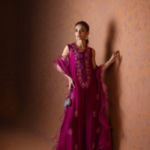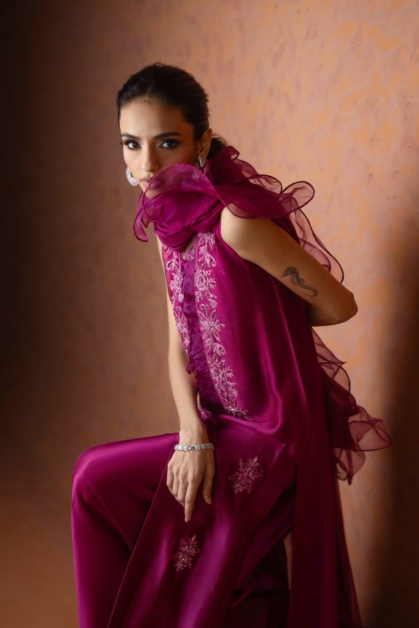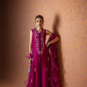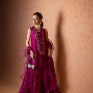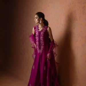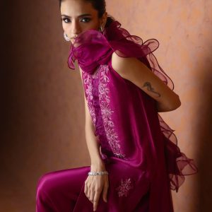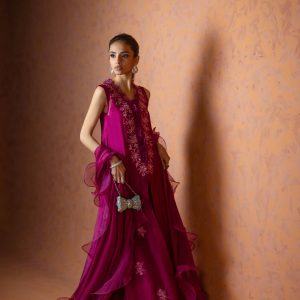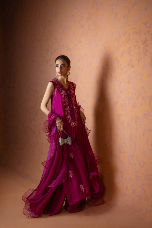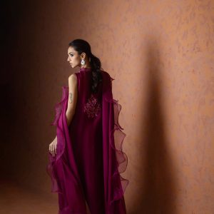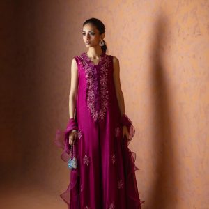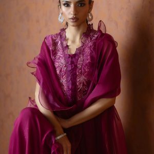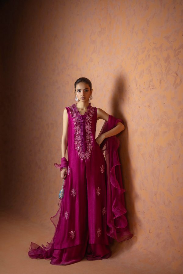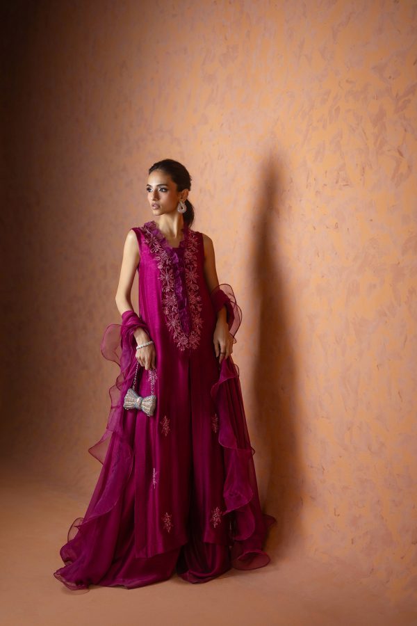 A regal magenta purple sheesha net long front open shirt, richly embellished with heavy aari embroidery and intricate handwork along the neckline, complemented by a delicate motif at the back. This sleeveless ensemble comes with a slip underneath, paired with flared butter silk pants for a graceful flow. The look is completed with a ruffled organza dupatta, adding a touch of drama and elegance. A statement outfit, perfect for weddings and festive occasions.