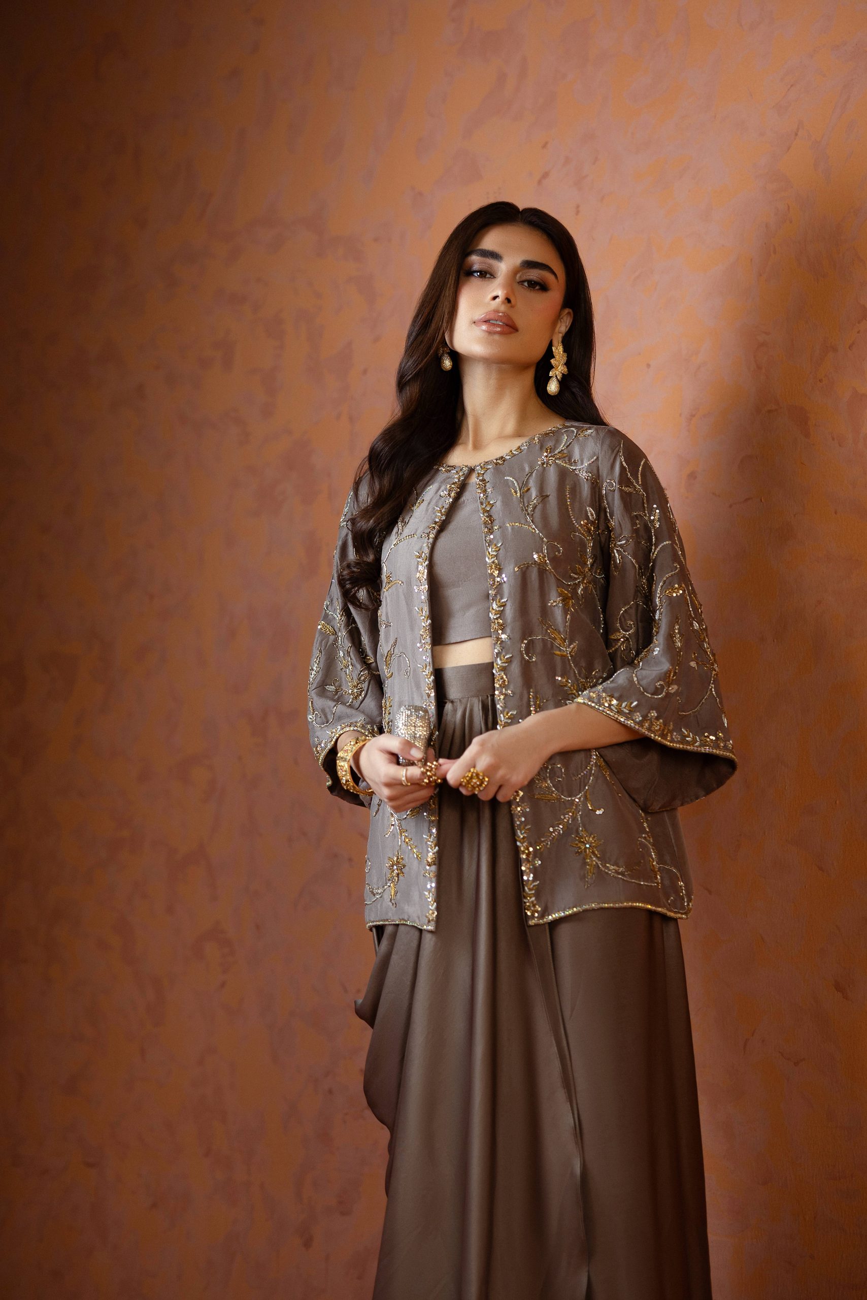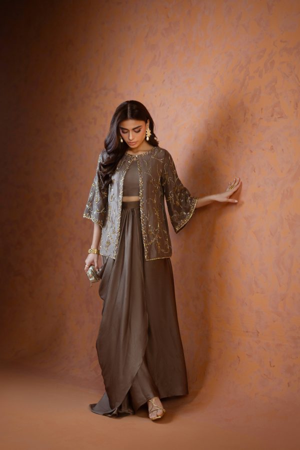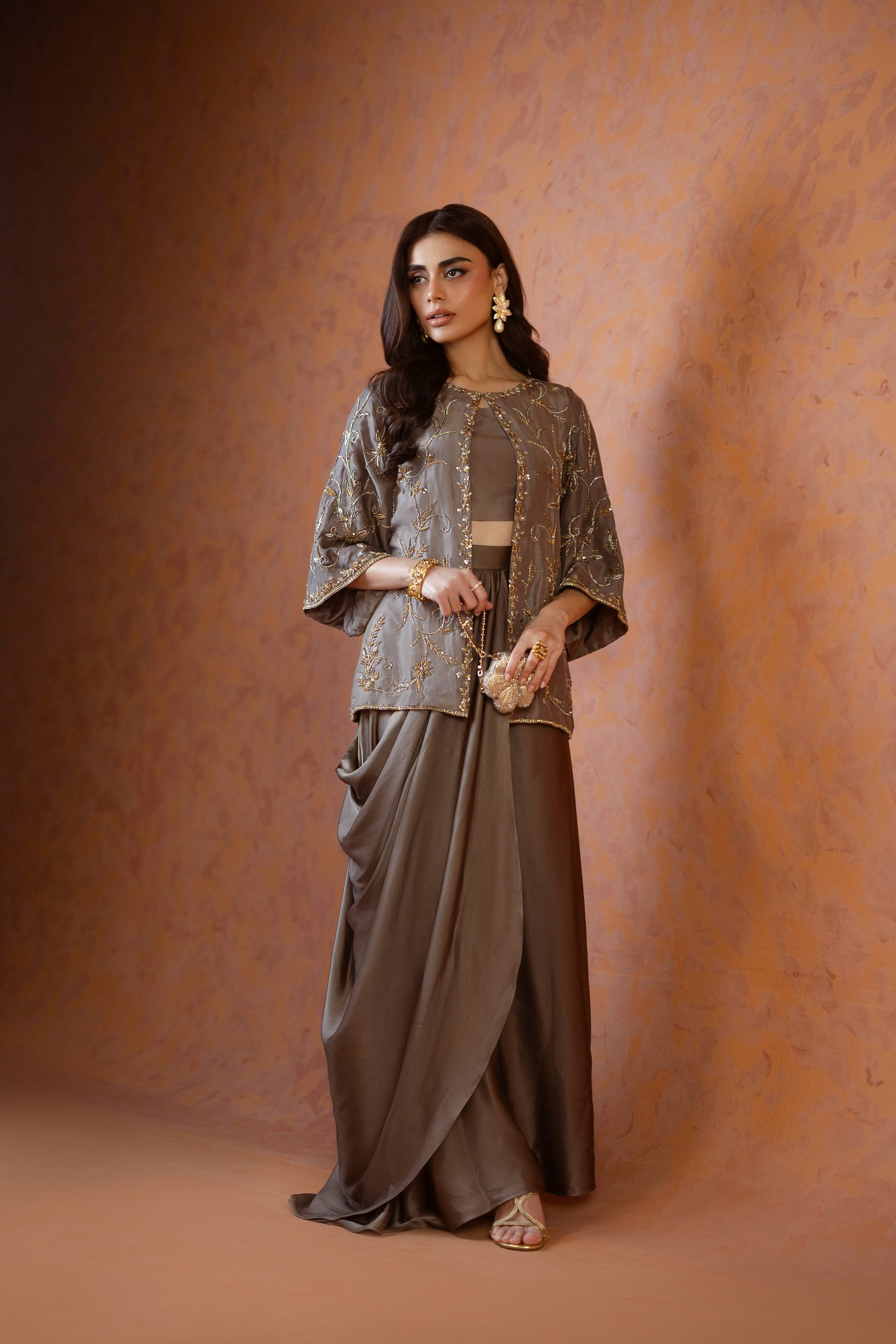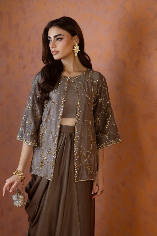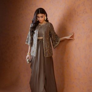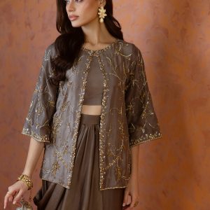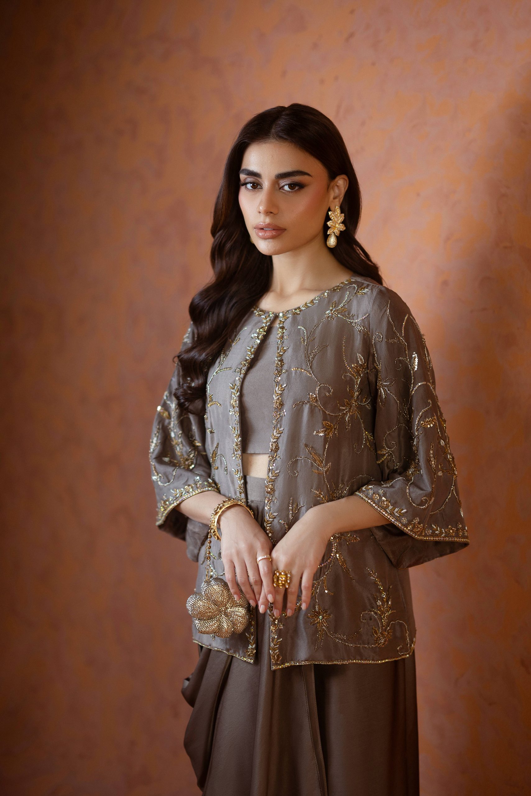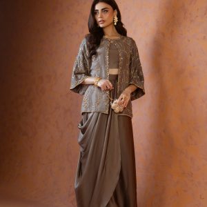 A champaign pure raw silk coat paired with a slip and a draped pure shamoose silk skirt. The coat features intricate handwork all over, creating a contemporary yet elegant look perfect for weddings and festive occasions.