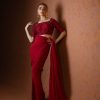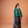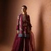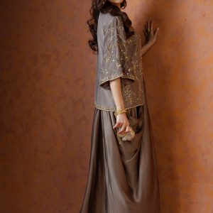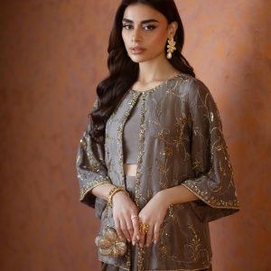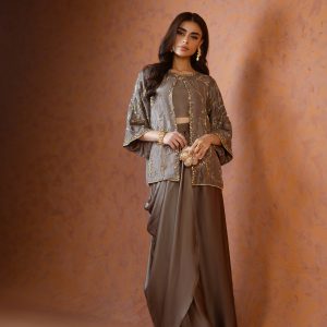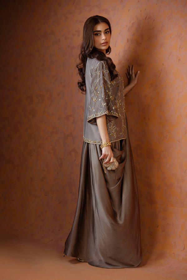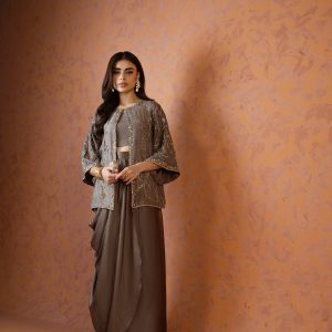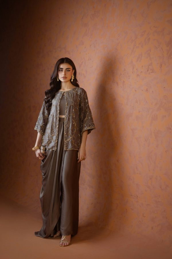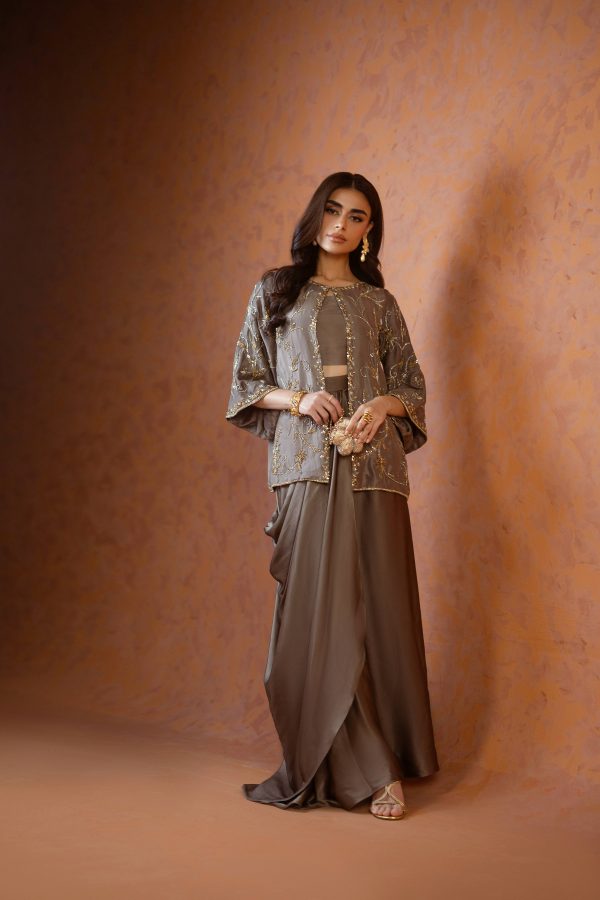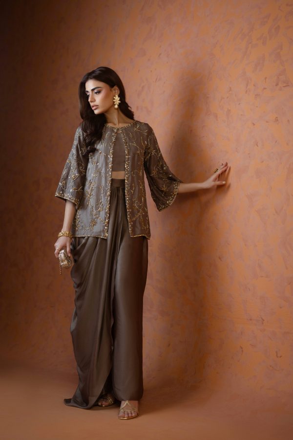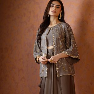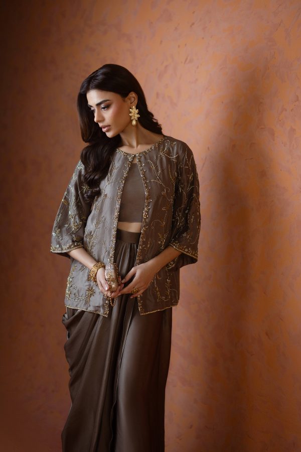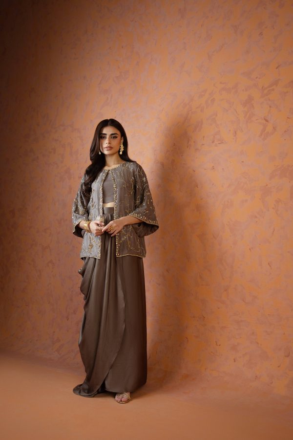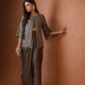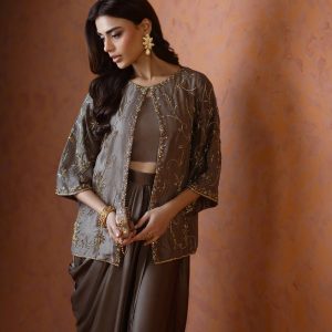 A champaign pure raw silk coat paired with a slip and a draped pure shamoose silk skirt. The coat features intricate handwork all over, creating a contemporary yet elegant look perfect for weddings and festive occasions.