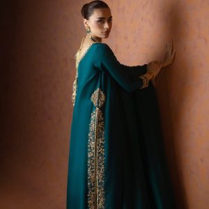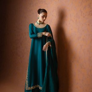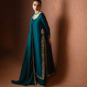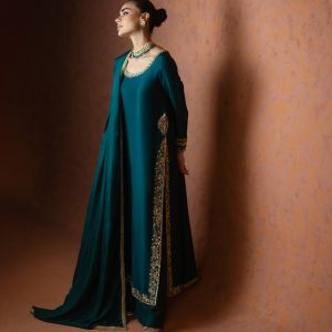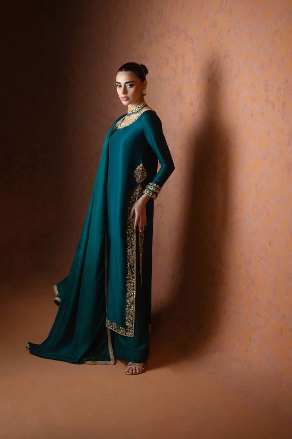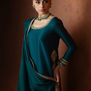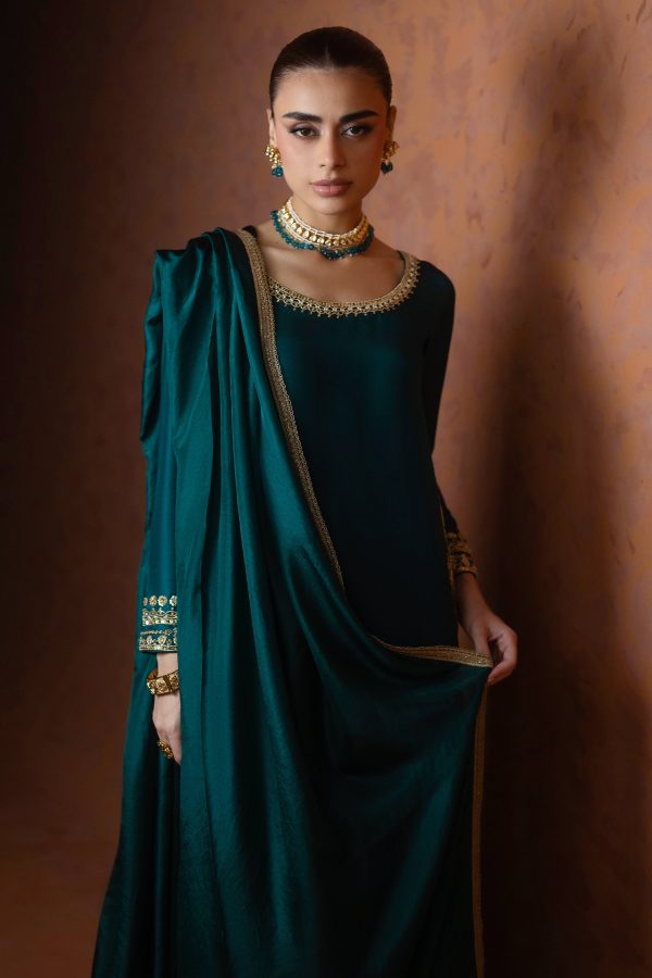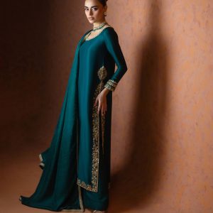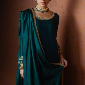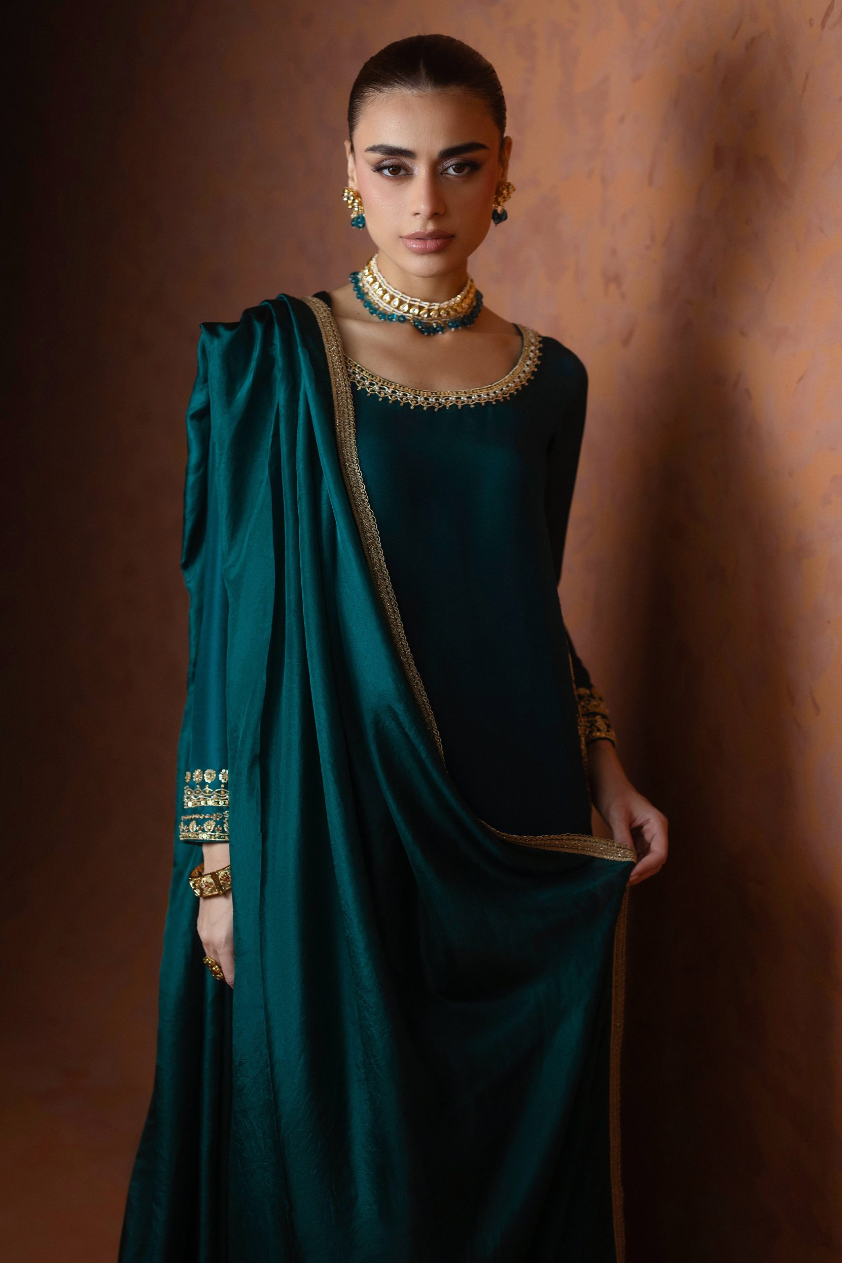 An exquisite emerald green pure raw silk shirt paired with pure raw silk pants, adorned with intricate all golden handwork and delicate tassels at the back for a refined finish. Styled with a medium silk dupatta, this ensemble is best for festive occasions and special events, radiating timeless elegance with a touch of glamour.