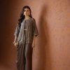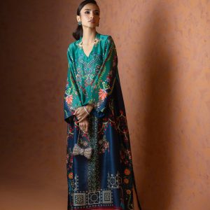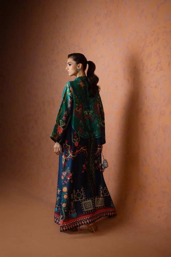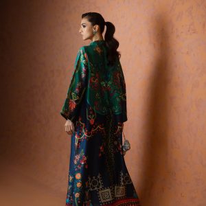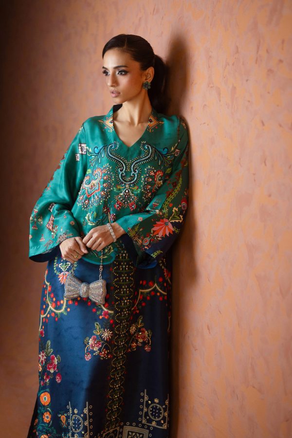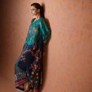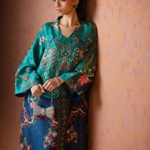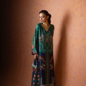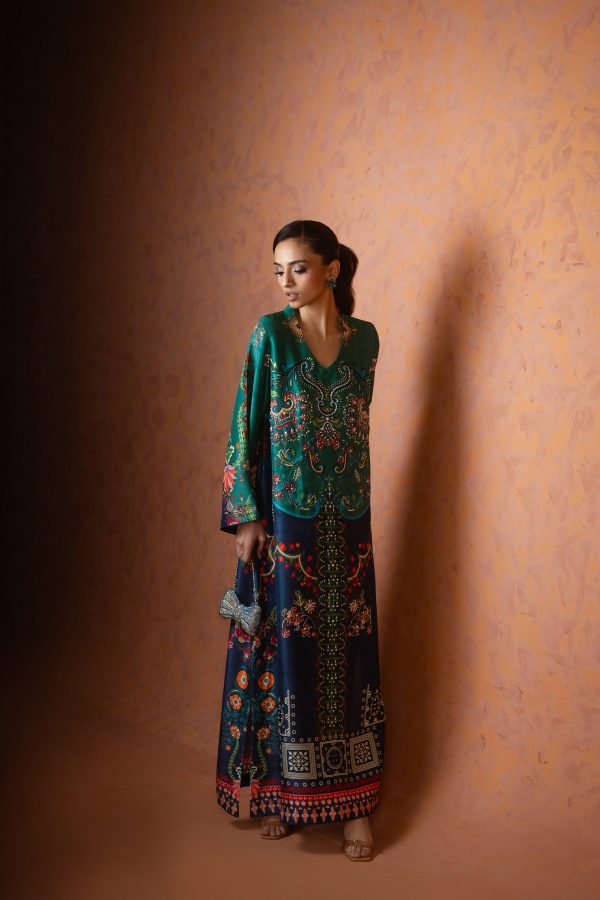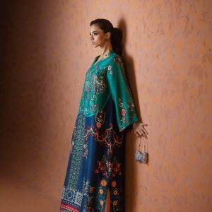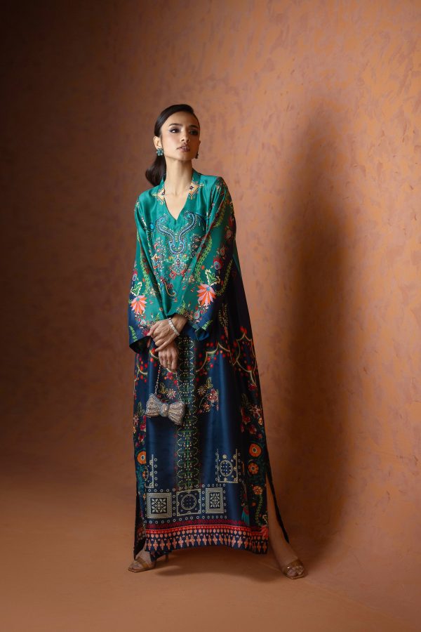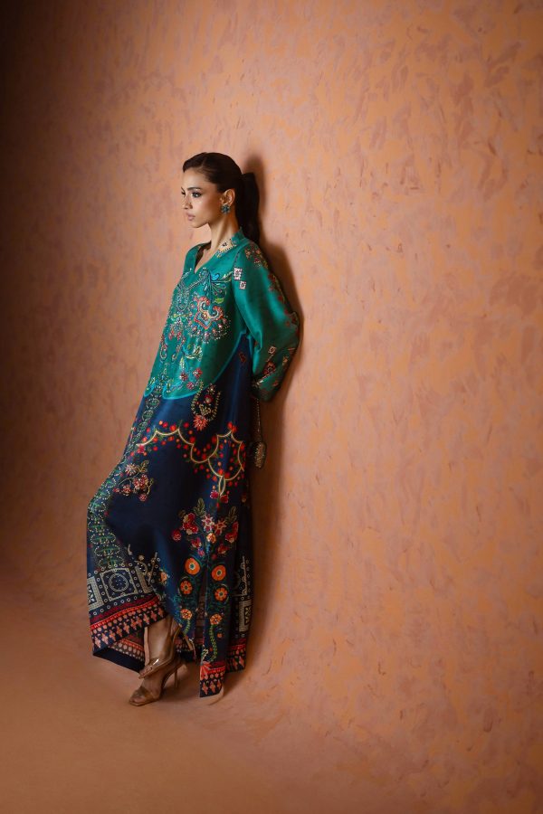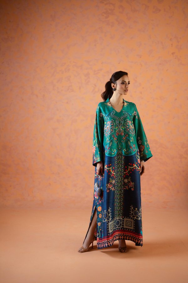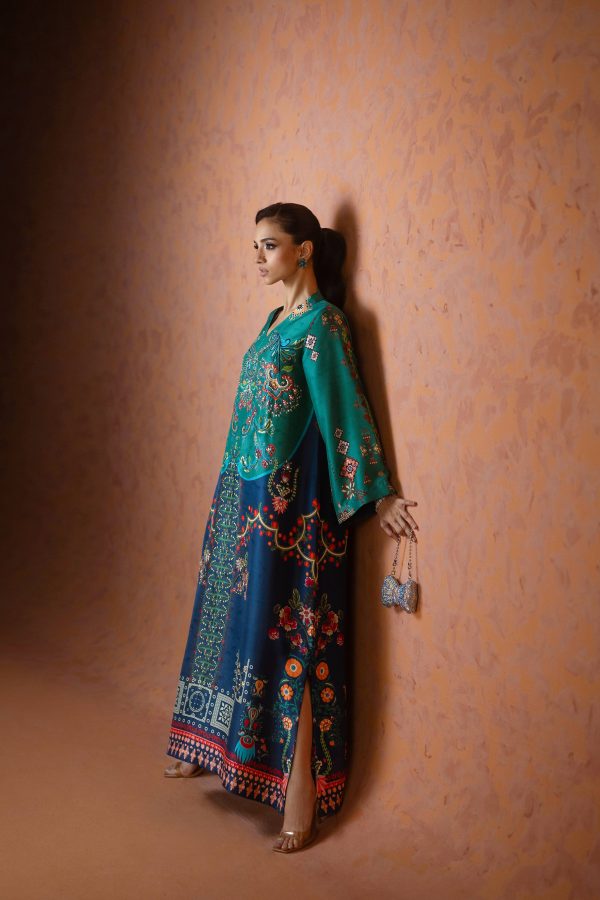 A perfect blue and green printed kaftan, crafted from pure raw silk in a rich and striking shade of blue. Adorned with intricate handwork all over, this elegant one piece is designed with short side slits for a graceful and effortless silhouette. A timeless ensemble that balances luxury and comfort ideal for festive occasions, weddings, and celebratory gatherings.