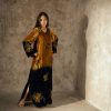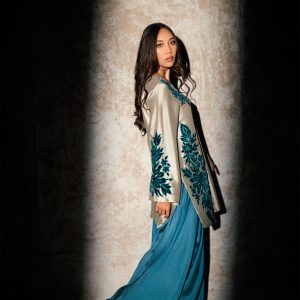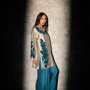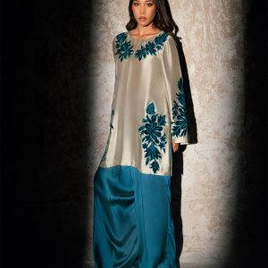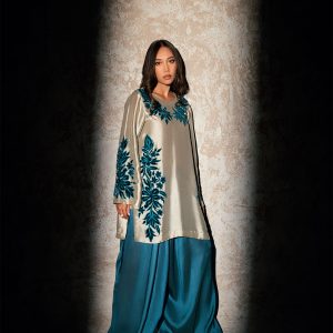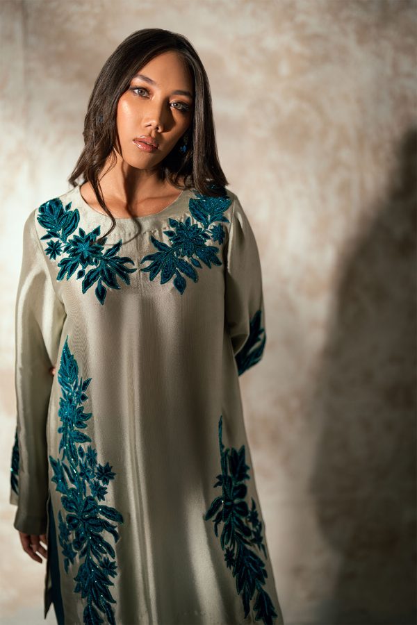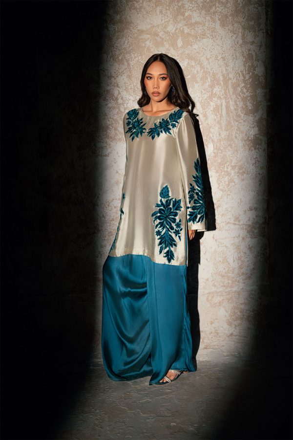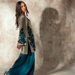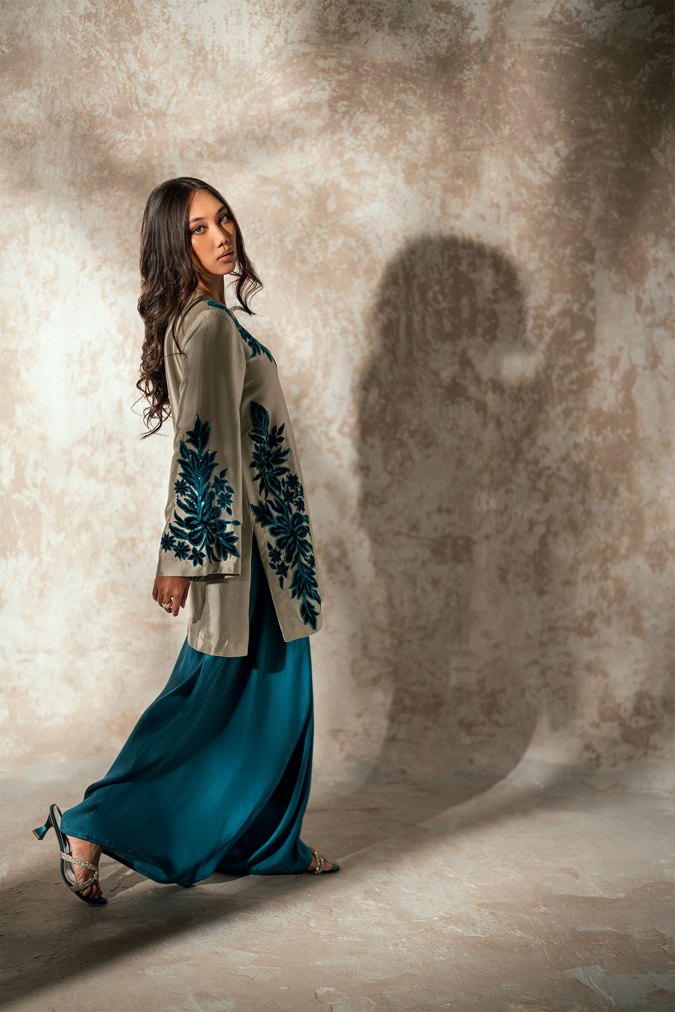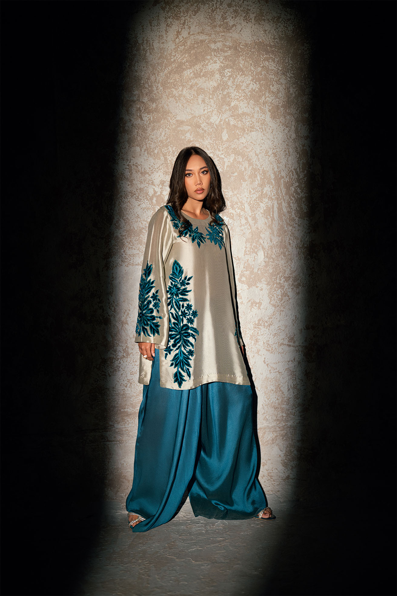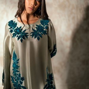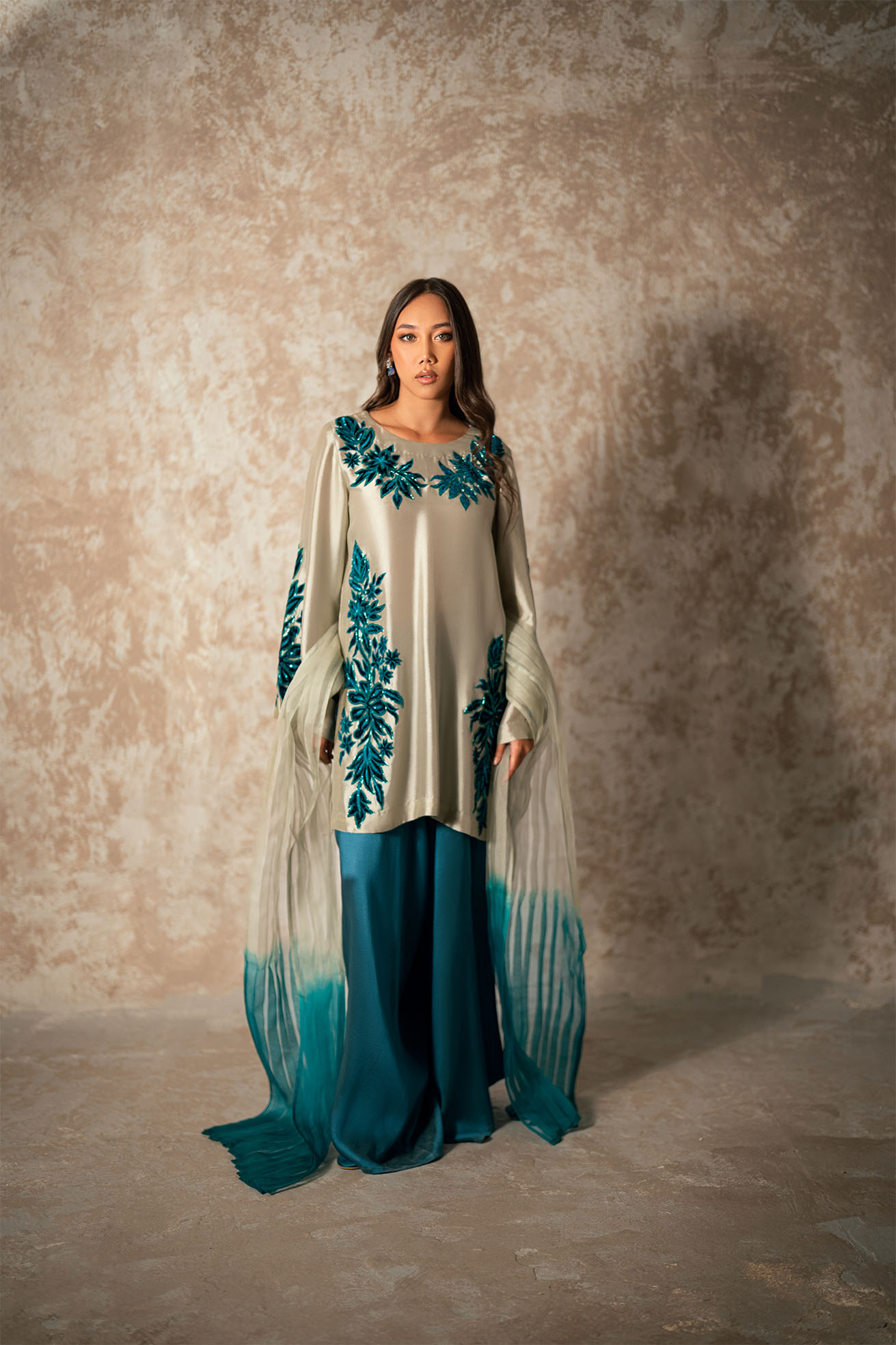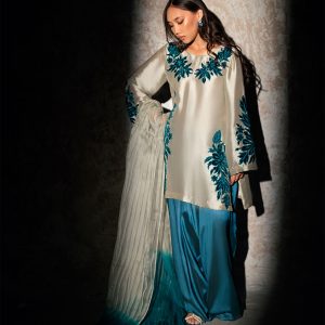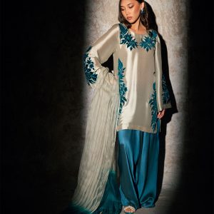 This vibrant and graceful three piece ensemble is crafted from luxurious butter silk. The old silver shirt is beautifully adorned with teal velvet appliqué, further enhanced with intricate handwork that adds a touch of elegance and charm. It is paired with teal shalwar style pants that perfectly complement the shirt. Completing the look is a stunning double shaded organza dupatta, designed with soft pleats for a refined and sophisticated finish.