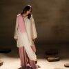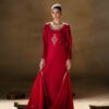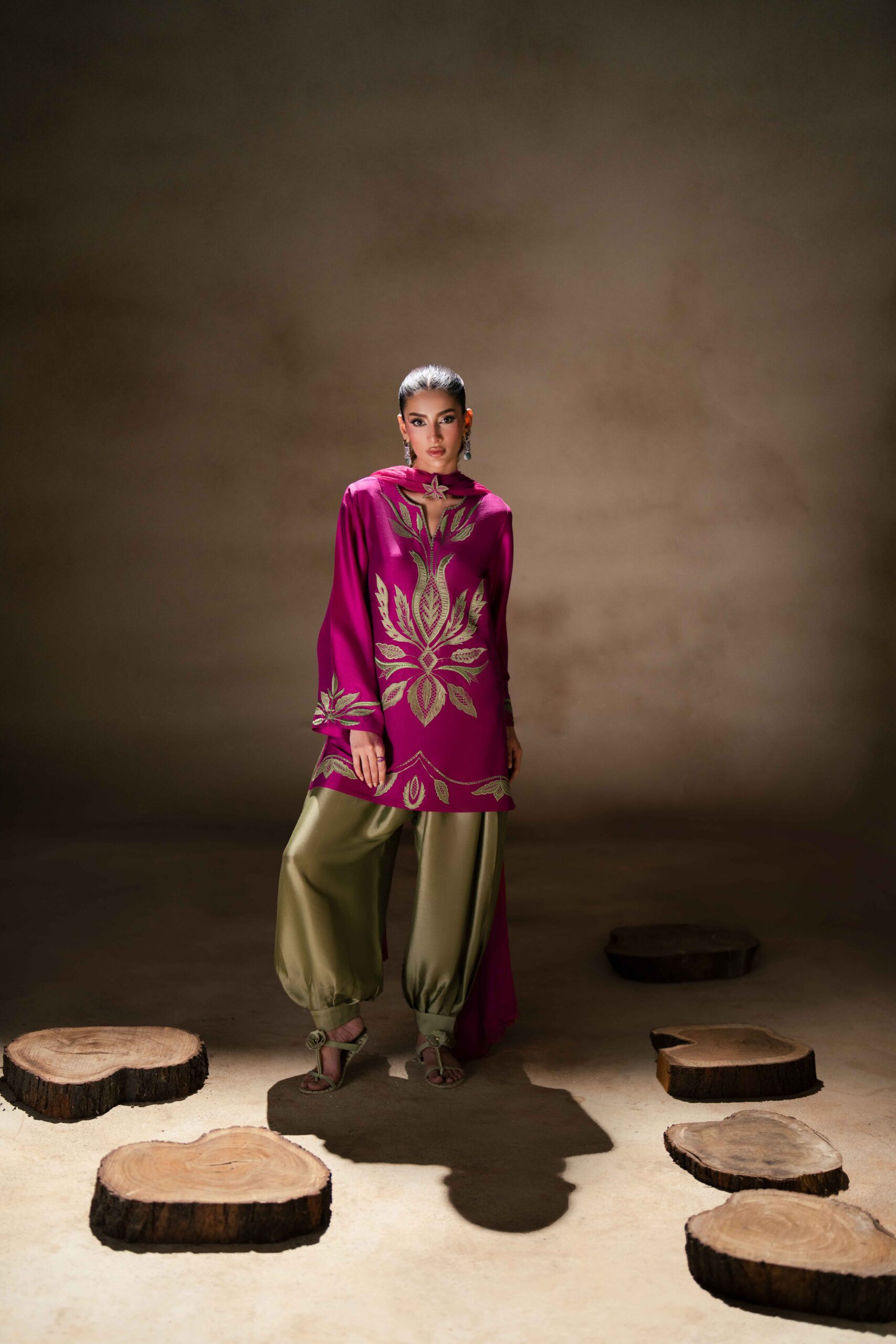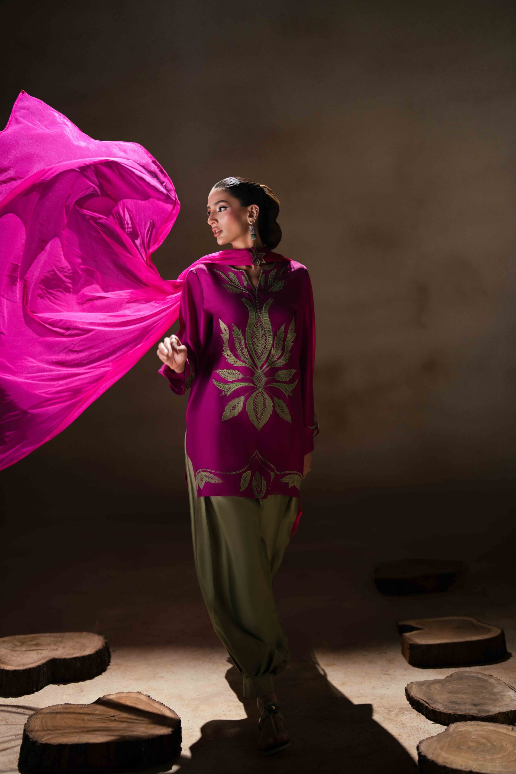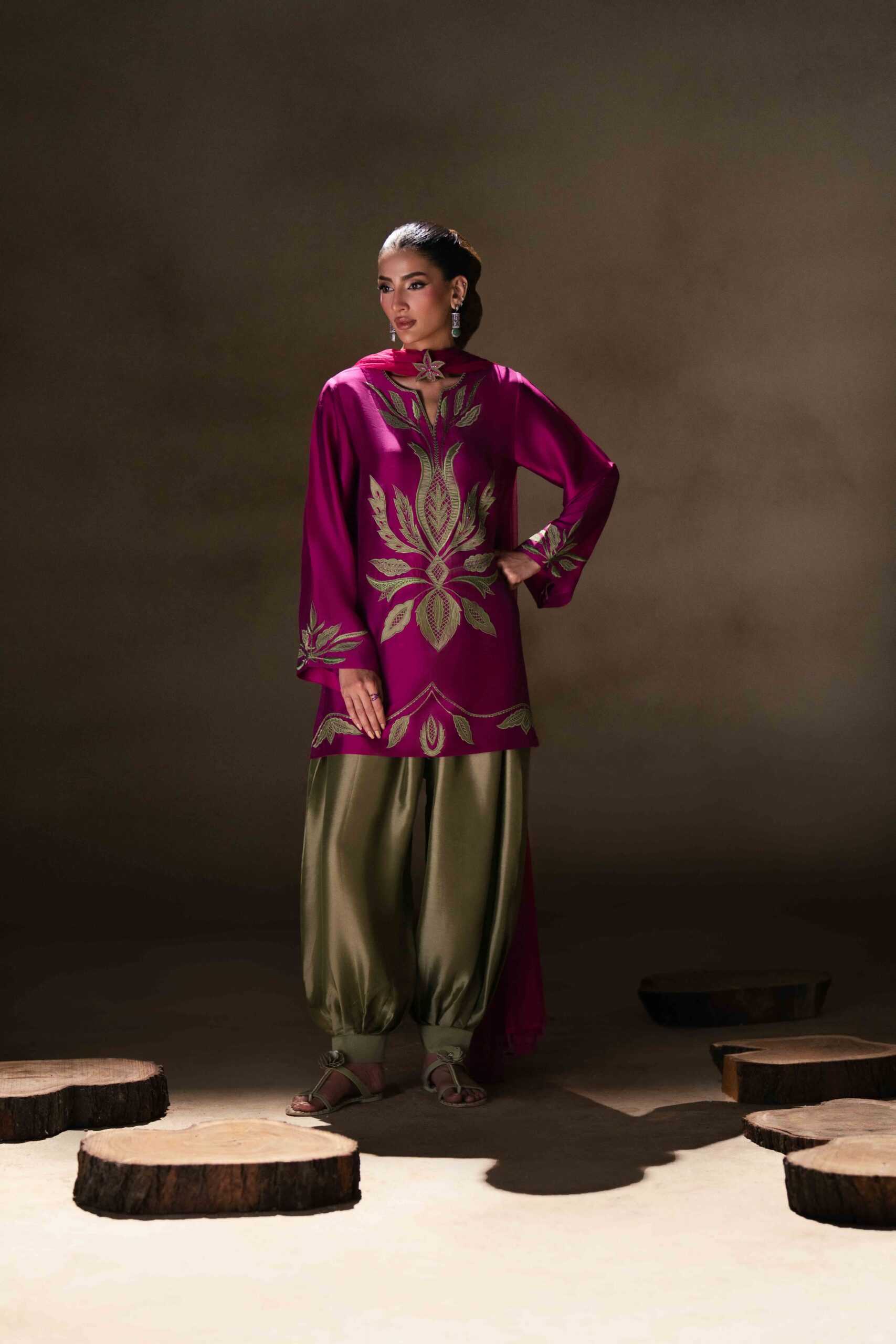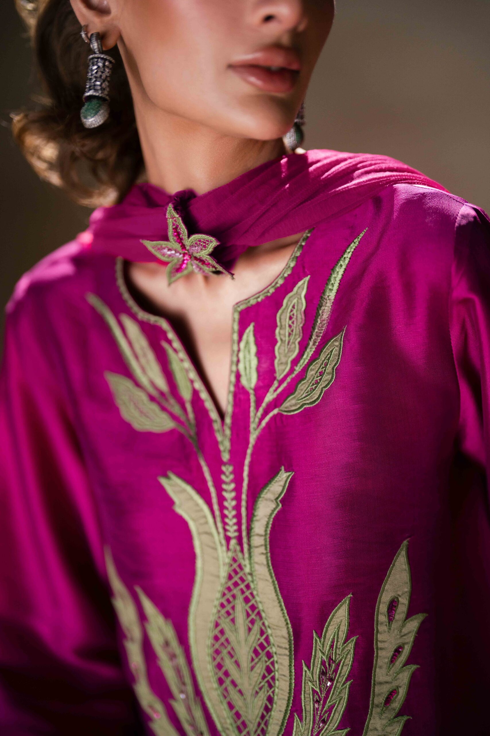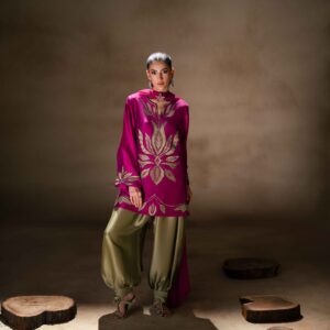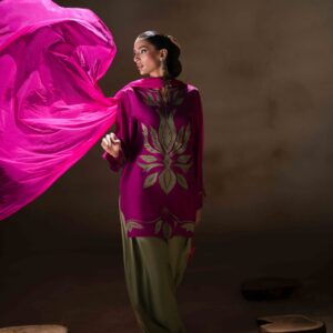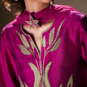 A vibrant fuchsia pink butter silk shirt beautifully adorned with green appliqué and delicate embroidery, creating a striking contrast. The shirt is paired with stylish green butter silk balloon pants that add a modern yet graceful silhouette. Completing the look is a fuchsia net dupatta, embellished with elegant 3D floral details that bring a soft, feminine charm to the ensemble.