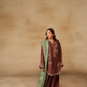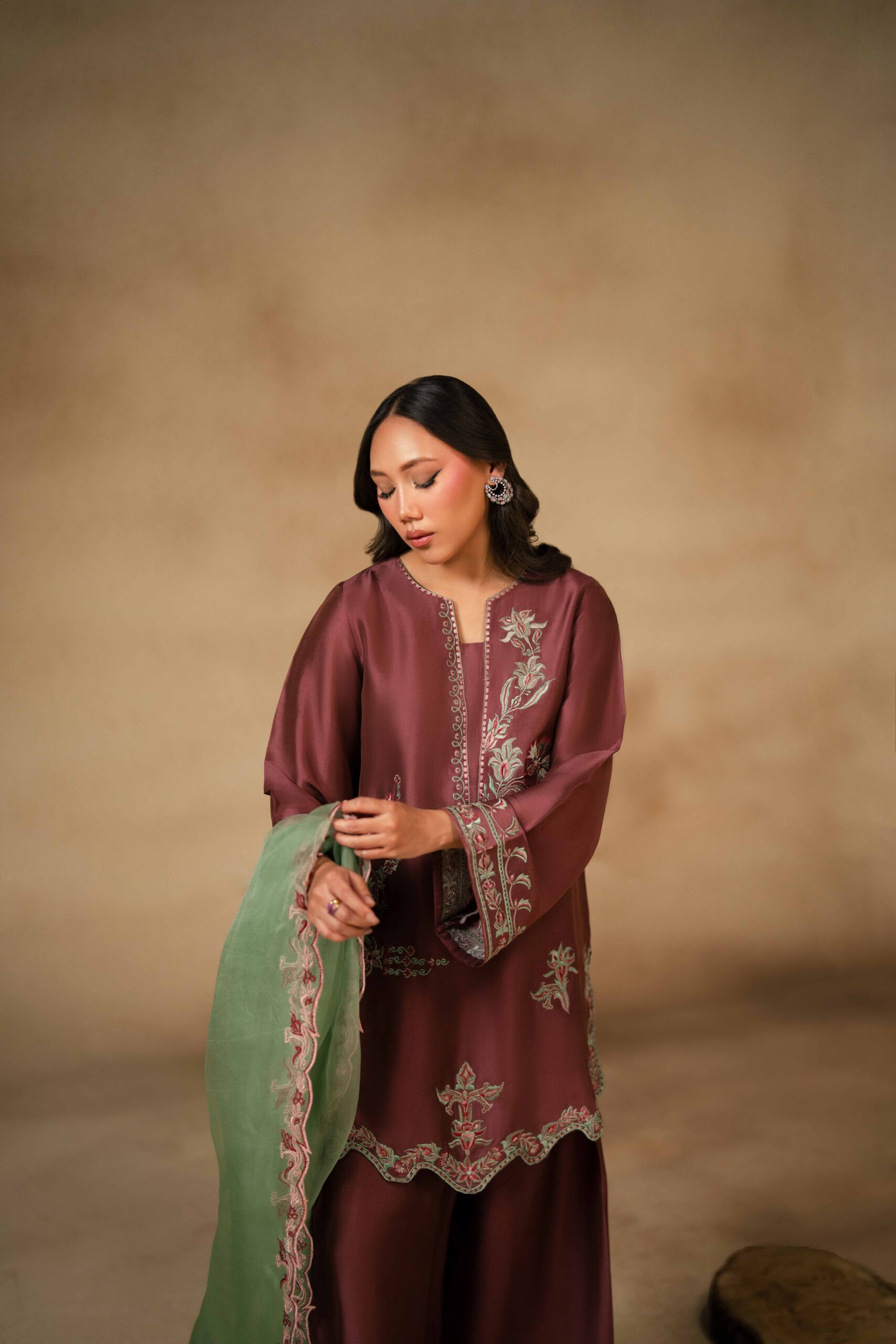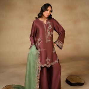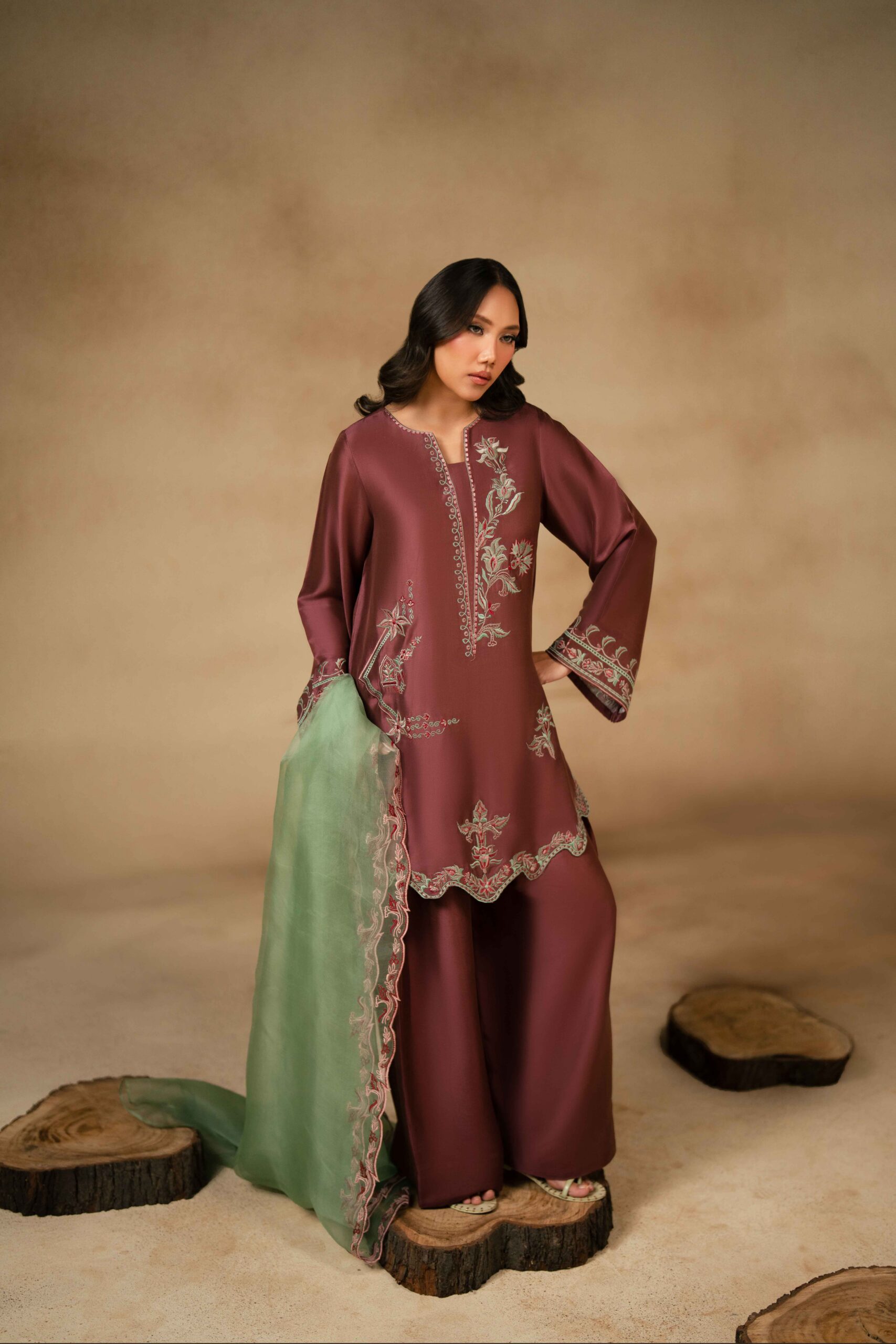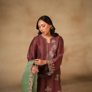 A graceful ensemble crafted in pure butter silk in a soft mauve pink hue. The short shirt is delicately adorned with intricate embroidery, adding a touch of elegance and charm. It is beautifully paired with a traditional farshi shalwar that enhances the classic silhouette. Completing the look is a sea green dupatta with intricate embroidery thoughtfully chosen to complement the embroidery and add a refreshing contrast to the outfit.