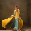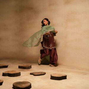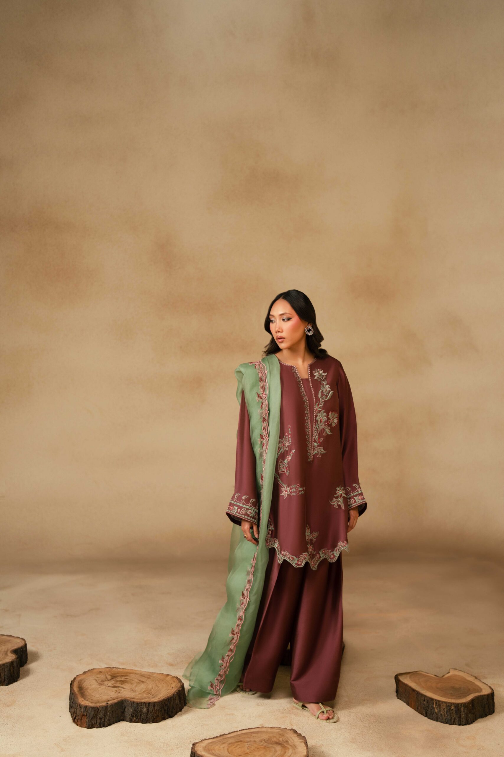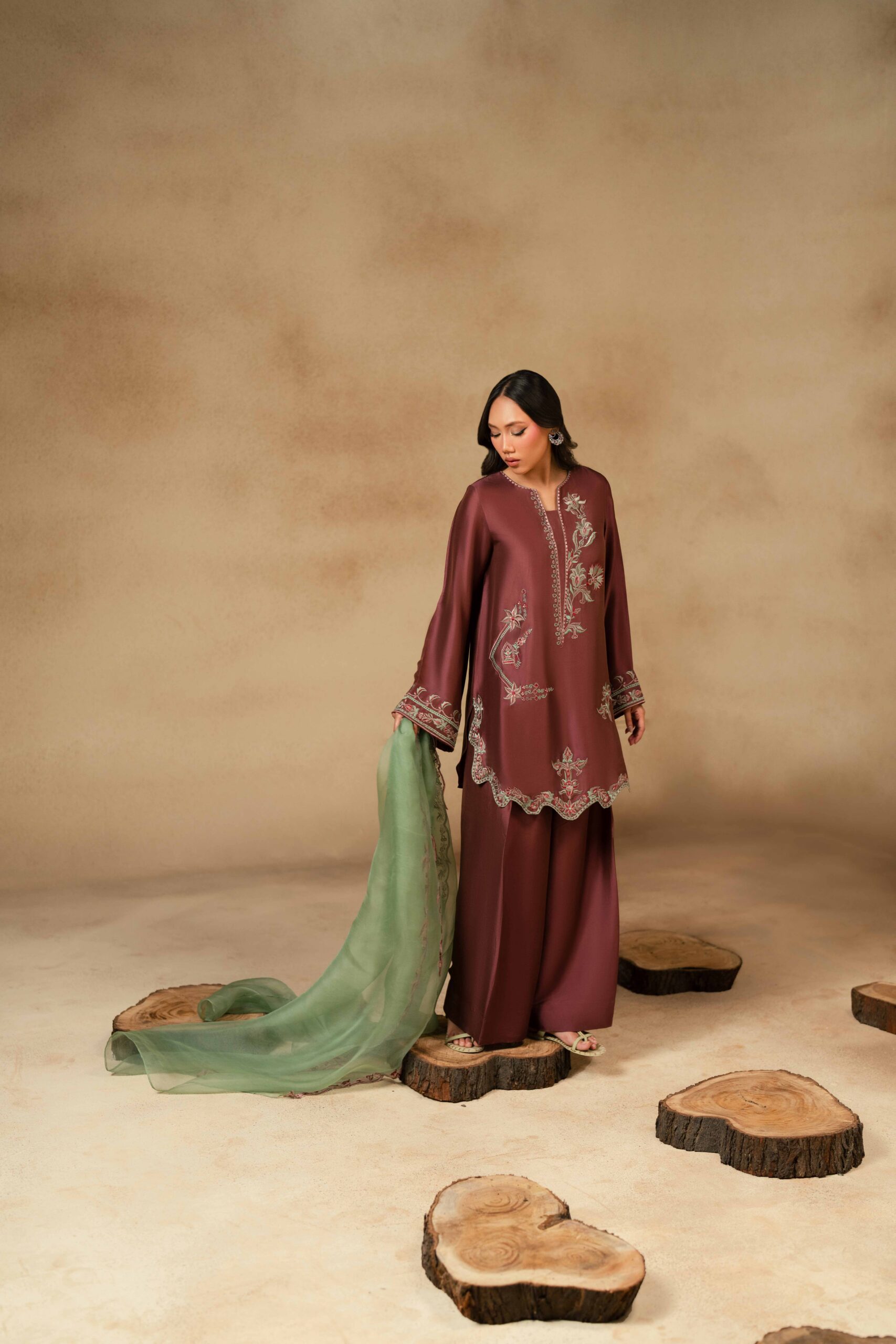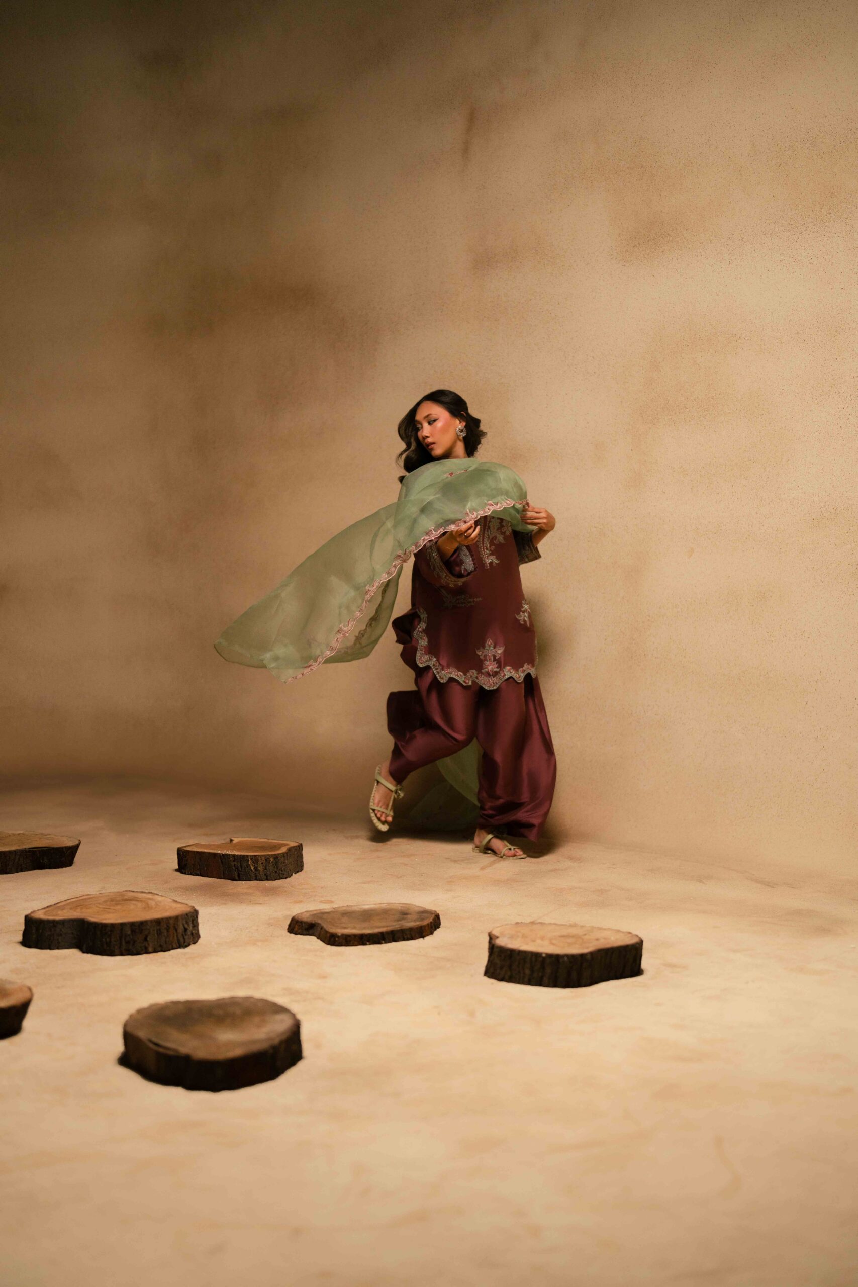 A graceful ensemble crafted in pure butter silk in a soft mauve pink hue. The short shirt is delicately adorned with intricate embroidery, adding a touch of elegance and charm. It is beautifully paired with a traditional farshi shalwar that enhances the classic silhouette. Completing the look is a sea green dupatta with intricate embroidery thoughtfully chosen to complement the embroidery and add a refreshing contrast to the outfit.