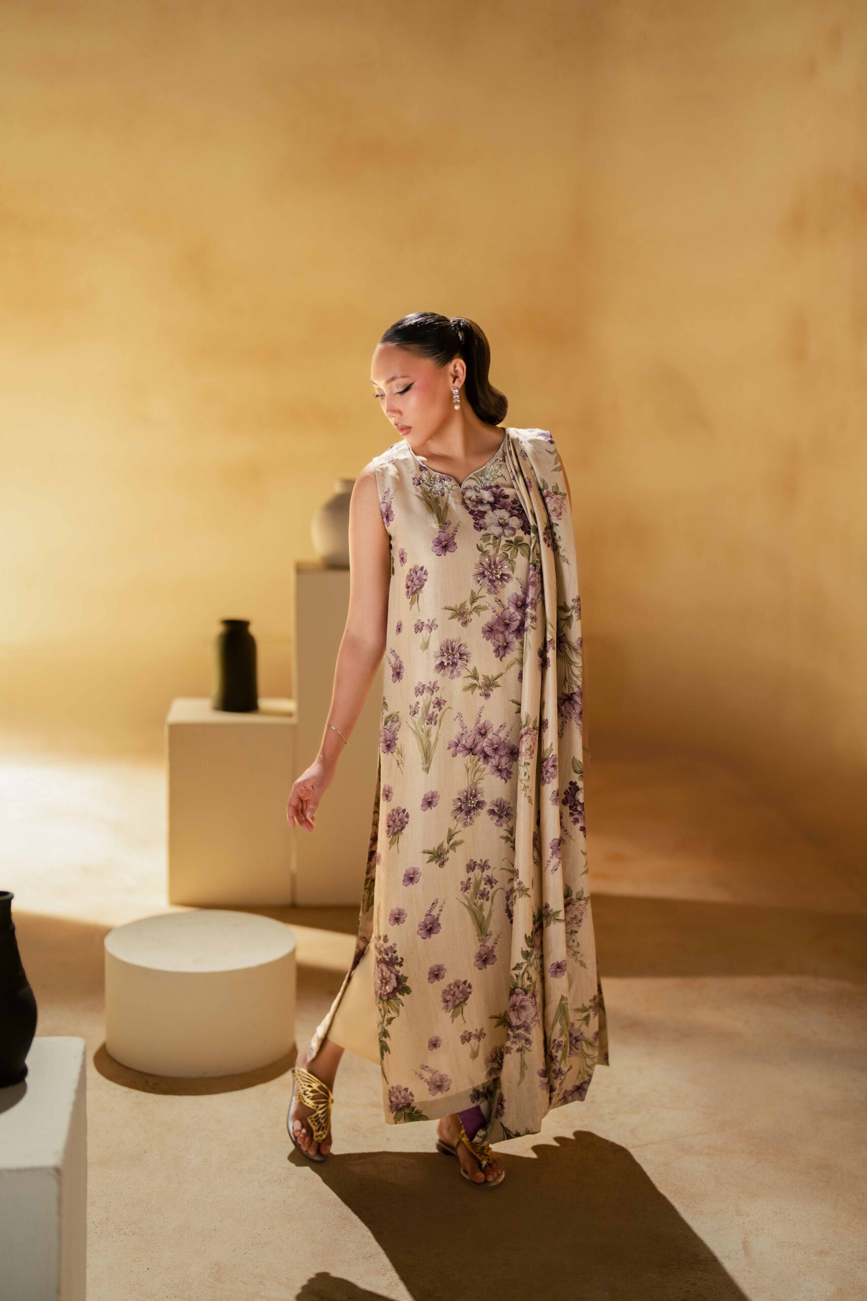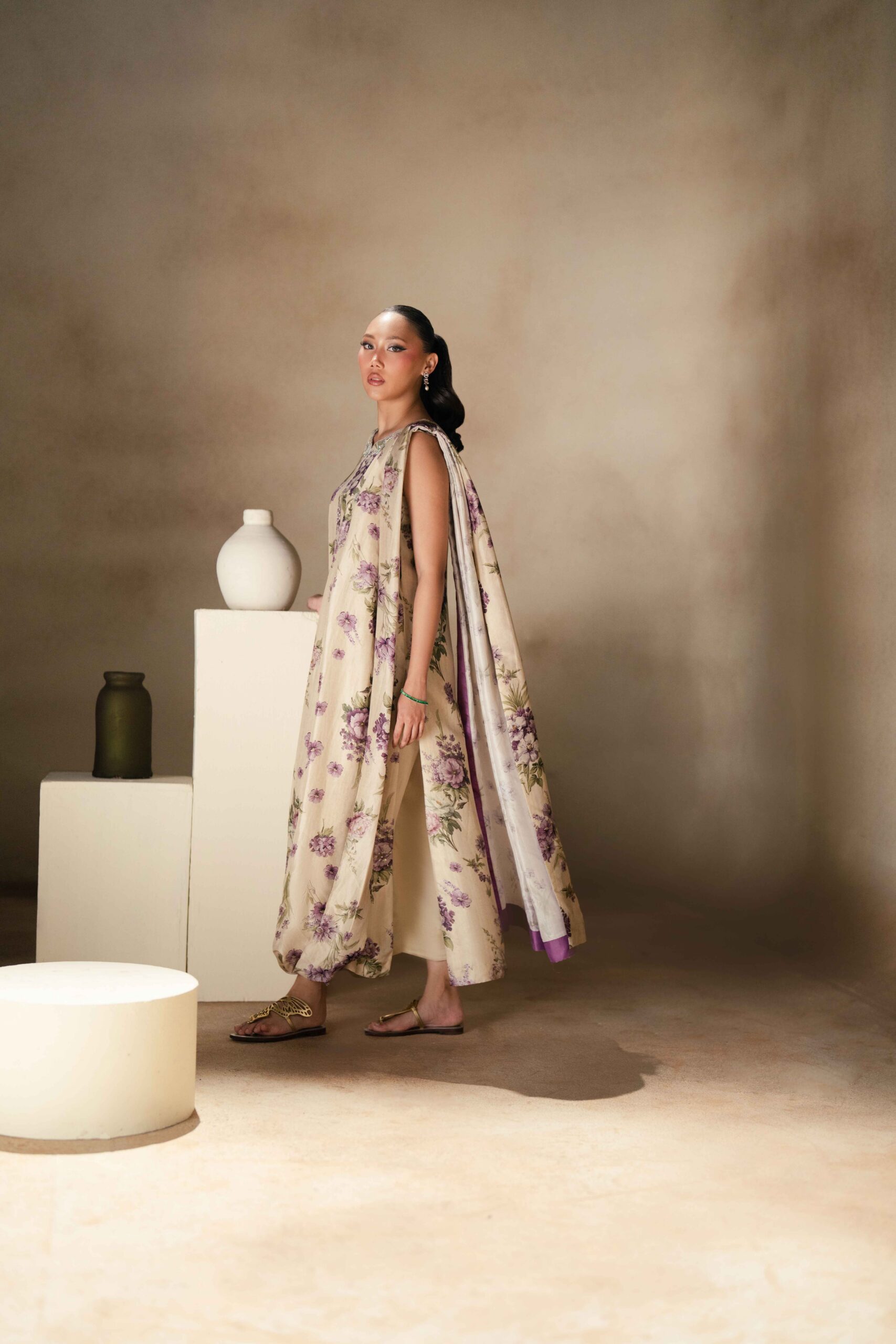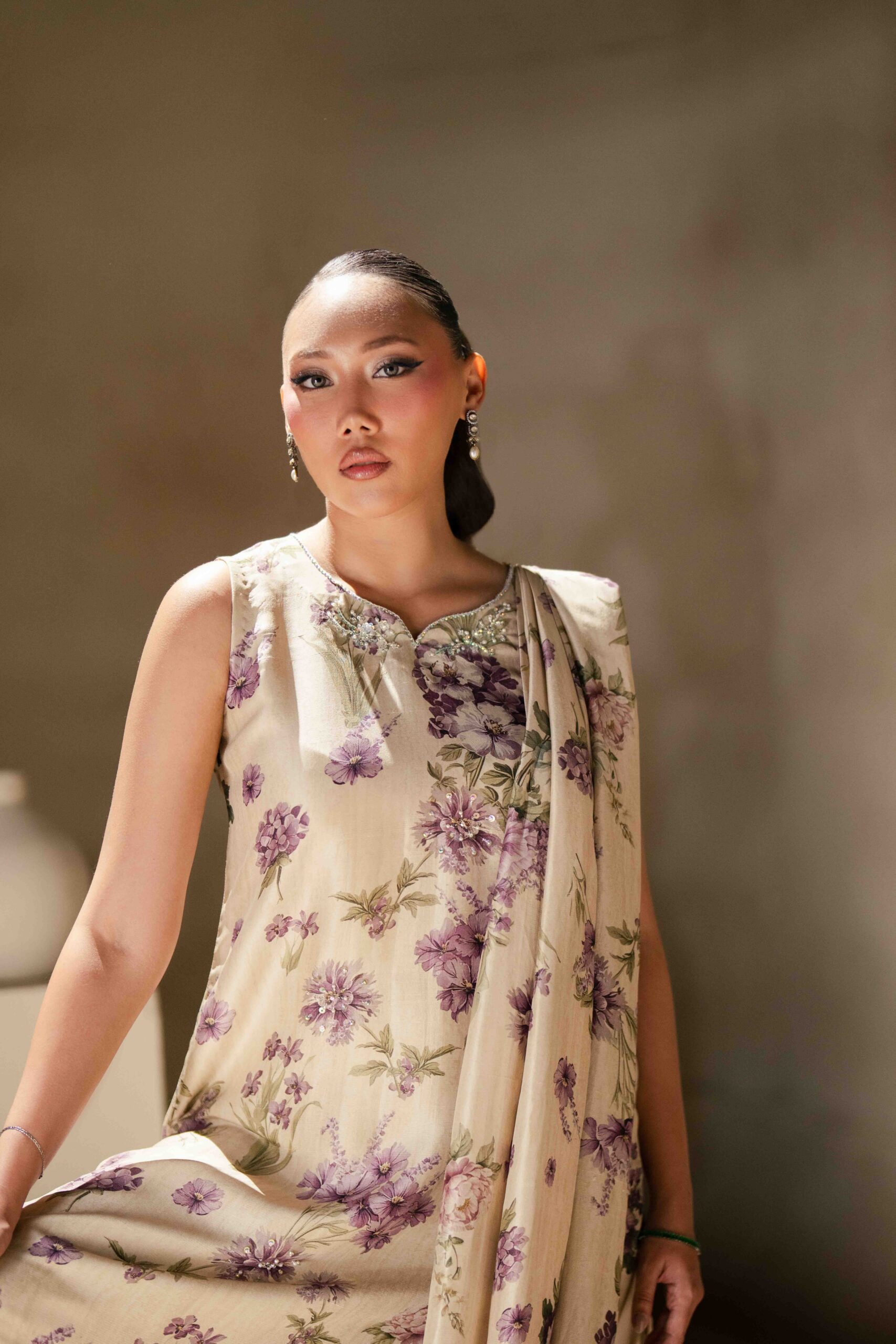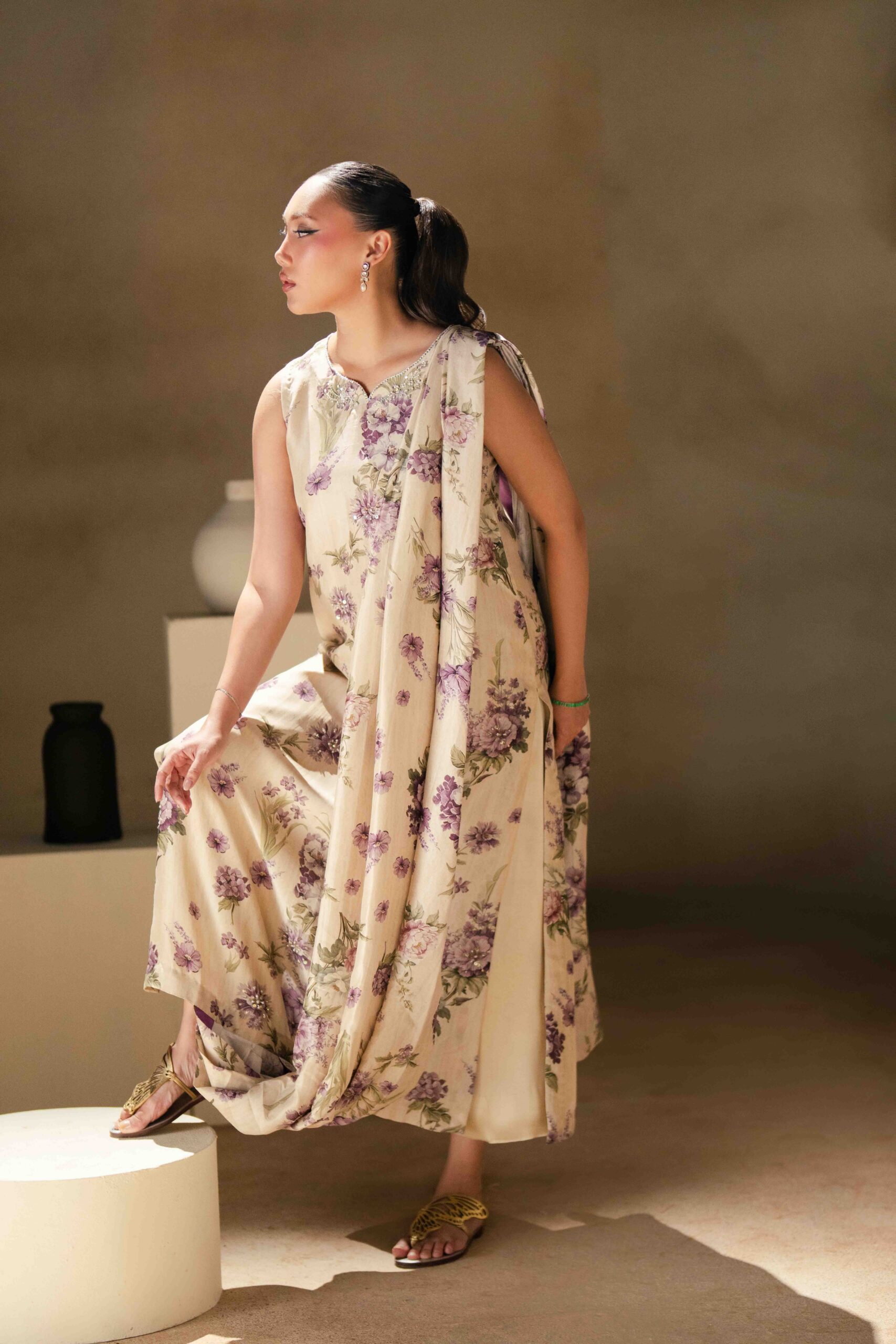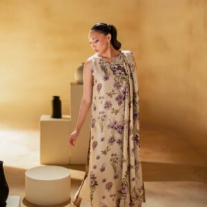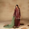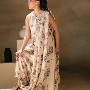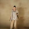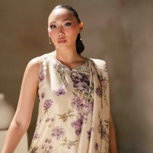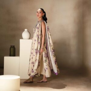 A pure raw silk digital printed shirt, beautifully designed with a draped dupatta attached to the hem of the shirt for a modern and graceful look. The shirt is delicately enhanced with handwork featuring tikki stones and pearls, adding subtle shimmer and elegance to the ensemble. It is paired with khadi silk straight pants that complete the outfit with a sleek and balanced silhouette.